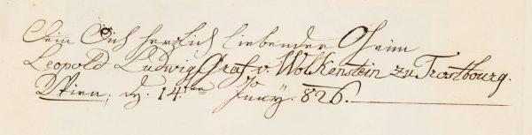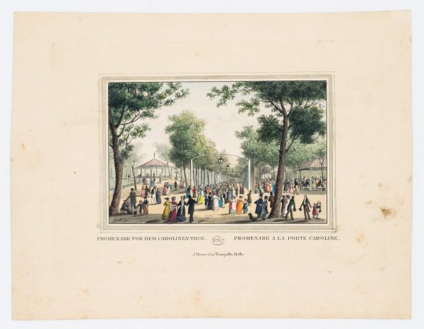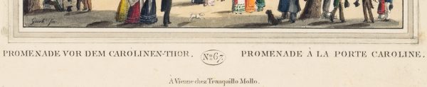 - Bezeichnung: Links in der Darstellung signiert mit “Gurk fec.”, darunter in deutsch und französisch beschriftet mit “PROMENADE VOR DEM CAROLINEN-THOR. PROMENADE ÀLA PORTE CAROLINE.”. Nummeriert mit “N.67”. Rückseitig handschriftliche Widmung des Tiroler Grafen Leopold von Wolkenstein-Trostburg.
