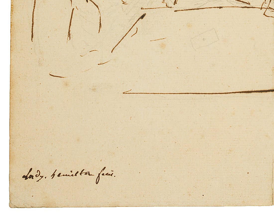 - Bezeichnung: Unten links signiert: „Lady Hamilton fecit.“. Allgemeine Informationen: Auf einem alten Beizettel bezeichnet: „From the .. collection of Nelson .. Joseph Mayer..“. unten links bezeichnet: „Lady Hamilton fec.“, verso bezeichnet: „this plays a sober game of whist. [..] begs for luck. [..] plays sharp. fearfull of being [..] by the others“ , auf der Unterlage bezeichnet: „From the Pettigrew collection of Nelson bought by Joseph Mayer FSA and solt at [..] Sothebys on July 21 for $510-This drawing was bought on this day in the drawing sale by Henry Boyle-„