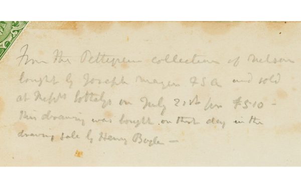 - Inscription: lower left signed: „Lady Hamilton fecit.“. General information: Inscribed on an old label: „From the … collection of Nelson … Joseph Mayer…“. unten links bezeichnet: „Lady Hamilton fec.“, verso bezeichnet: „this plays a sober game of whist. [..] begs for luck. [..] plays sharp. fearfull of being [..] by the others“ , auf der Unterlage bezeichnet: „From the Pettigrew collection of Nelson bought by Joseph Mayer FSA and solt at [..] Sothebys on July 21 for $510-This drawing was bought on this day in the drawing sale by Henry Boyle-„
