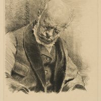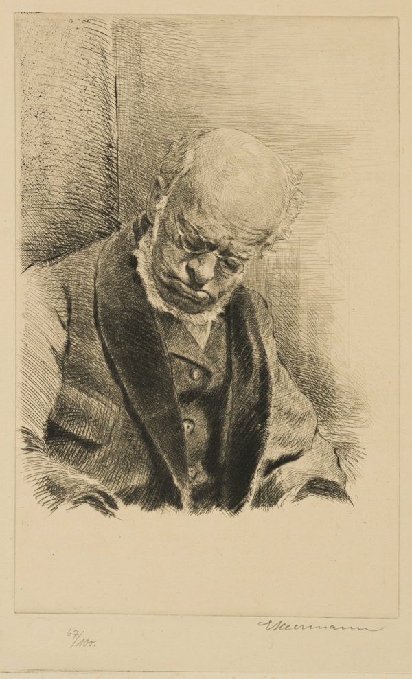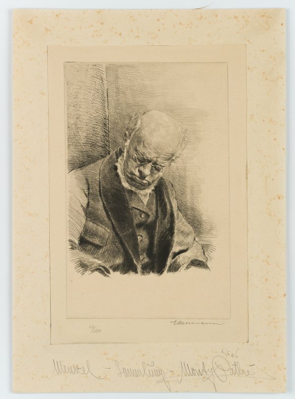 - Description: The print shows the aged artist Adolf Friedrich Erdmann Menzel (1815 Breslau – Berlin 1905) in slumber. However, this is not a long sleep, but a spontaneous nap. Heermann shows the artist sitting down and dozing off at the moment of exhaustion, drawing strength for new artistic inspiration from his short sleep.