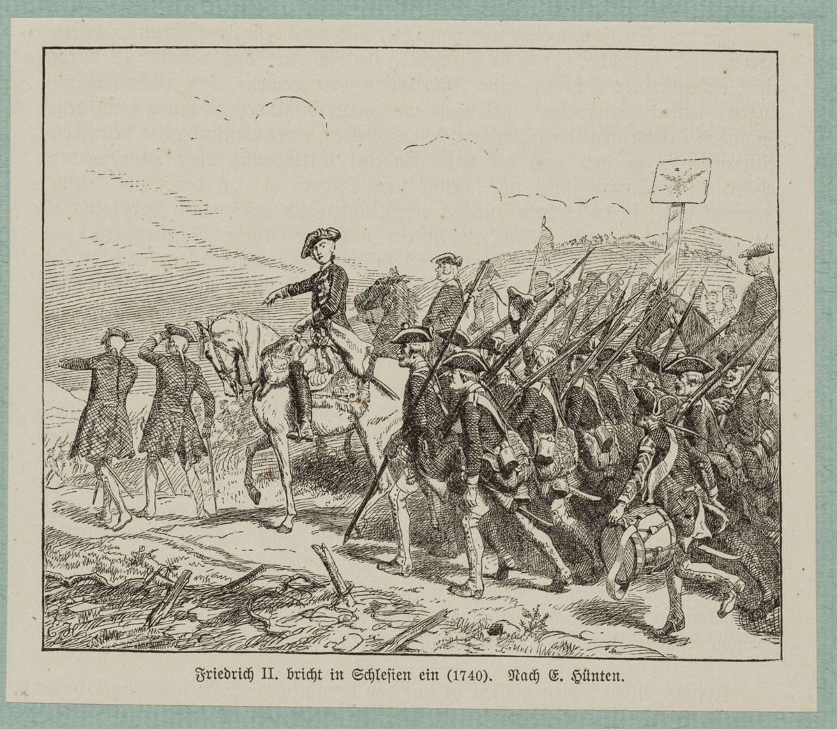 - Description: Frederick the Great rides ahead of his marching soldiers and begins the First Silesian War in 1740.