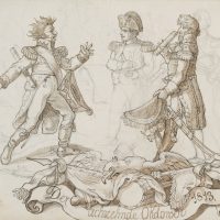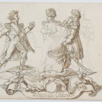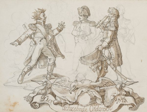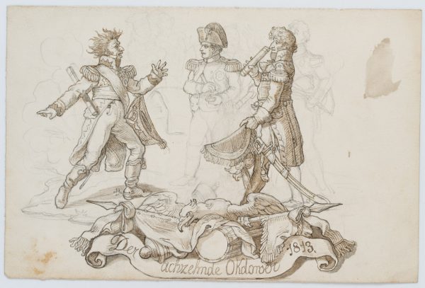 - Inscription: Inscribed “Der achzehnde Okdover 1813.” at the bottom of the banner. In Leipzig, the allies Russia, Austria, Prussia and Sweden fought against Napoleon and his Grande Armée from 16 to 19 October 1813. The 18th of October, the subject of this illustration, finally brought victory over Napoleon with more than 90,000 soldiers killed or wounded. Napoleon himself, the defeated emperor, is depicted in the centre – flags and eagles at the lower edge of the picture are the traces of his rule – as well as next to him and in the background the monarchs Alexander I of Russia, Francis I of Austria and Frederick William III of Prussia, allied against Napoleon and representing the victory over the revolution embodied by Napoleon. Original drawing from the hand of the Munich artist Eduard Ille; Ille was a painter and talented draughtsman who knew how to apply his talent in the fields of illustration, caricature and writing.