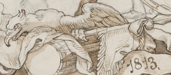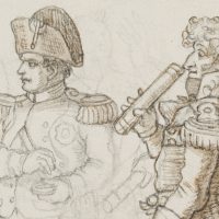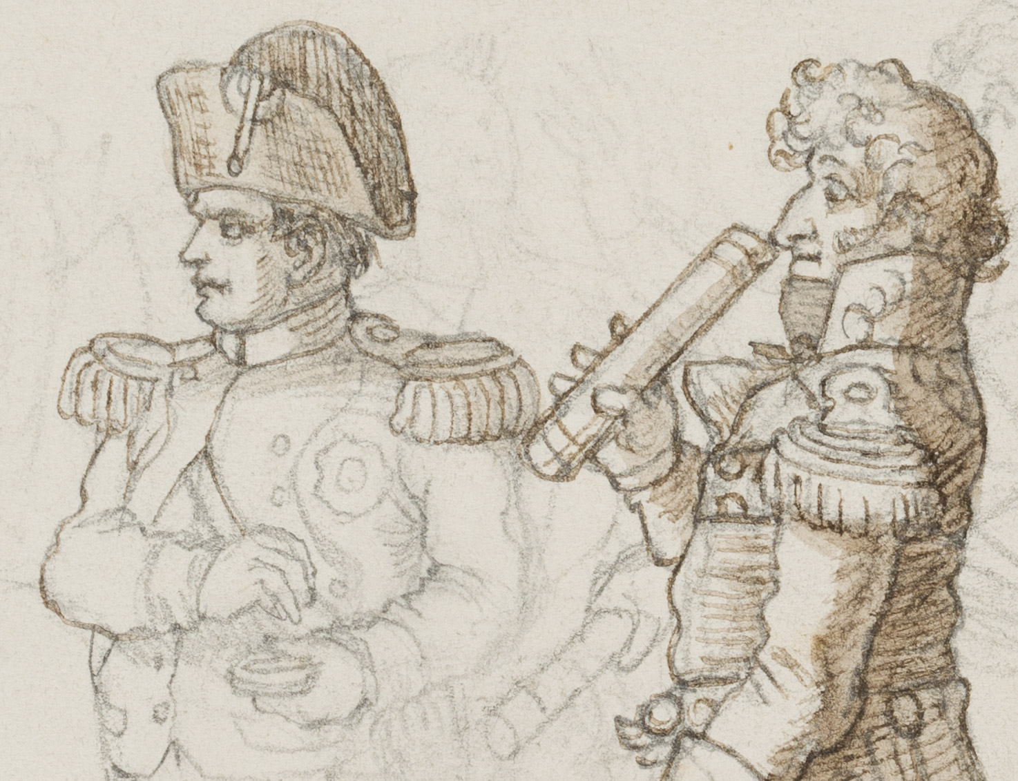- Bezeichnung: Unten auf dem Spruchband bezeichnet “Der achzehnde Okdover 1813.”. In Leipzig kämpften die Verbündeten Russland, Österreich, Preußen und Schweden vom 16. bis 19. Oktober 1813 gegen Napoleon und seine Grande Armée. Der auf der vorliegenden Illustration thematisierte 18. Oktober brachte schließlich den Sieg über Napoleon mit mehr als 90.000 getöteten oder verletzten Soldaten. Mittig ist Napoleon selbst, der besiegte Kaiser, dargestellt – Fahnen und Adler am unteren Bildrand sind die Spuren seiner Herrschaft – sowie neben ihm und im Hintergrund die gegen Napoleon verbündeten Monarchen Alexander I. von Russland, Franz I. von Österreich und Friedrich Wilhelm III. von Preußen, die für den Sieg über die durch Napoleon verkörperte Revolution stehen. Original-Zeichnung aus der Hand des Münchner Künstlers Eduard Ille; Ille war Maler und begabter Zeichner, der es verstand, sein Talent auf den Gebieten der Illustration, Karikatur und Schriftstellerei zum Einsatz zu bringen.