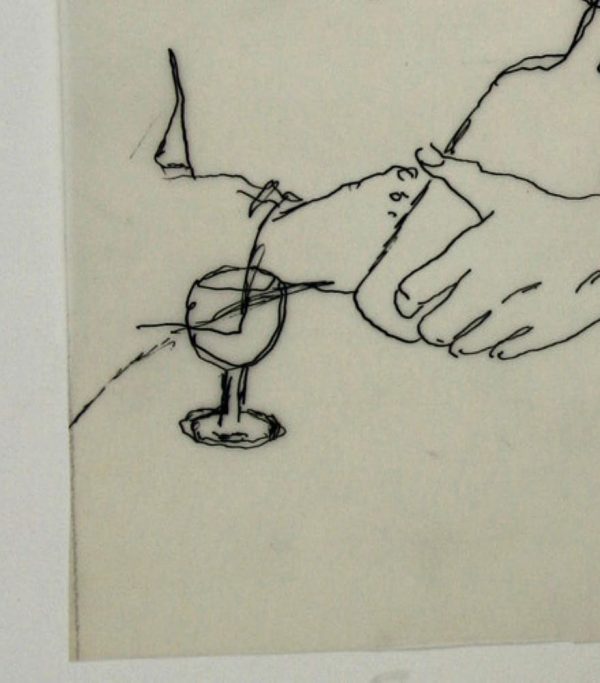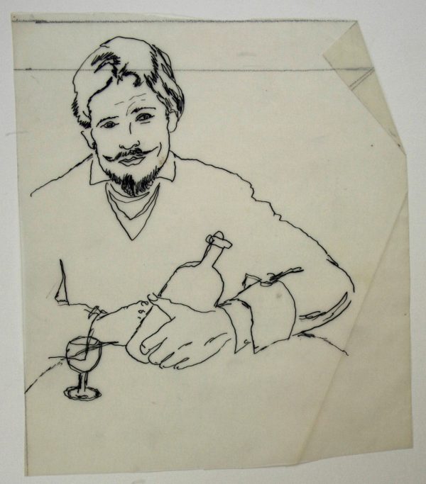- Description: Erhard Klepper, Half-length portrait of a young man, pen-and-ink drawing in black over lead on parchment paper, c. 1950. Description:Pen-and-ink drawing in black over lead on parchment paper. Very successful bust portrait of a young man with a beard. In front of him is a wine glass on a round table, he holds the bottle in his hand. He looks at the viewer with a friendly smile. Erhard Klepper (Beuthen 1906-Berlin 1980), wrote numerous books on the history of fashion and illustrated them with his own drawings; his aim was to capture clothing together with its accessories. Among other things, Klepper edited the books “Die Modedes 18. Jh.” and “150 JahreWeltgeschichte für die Dame. Compiled according to contemporary reports and models 1801-1950” (first edition Herbig Verlagsbuchhandlung Berlin 1955, 223 pages with numerous fashion drawings by Erhard Klepper).