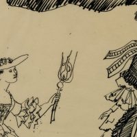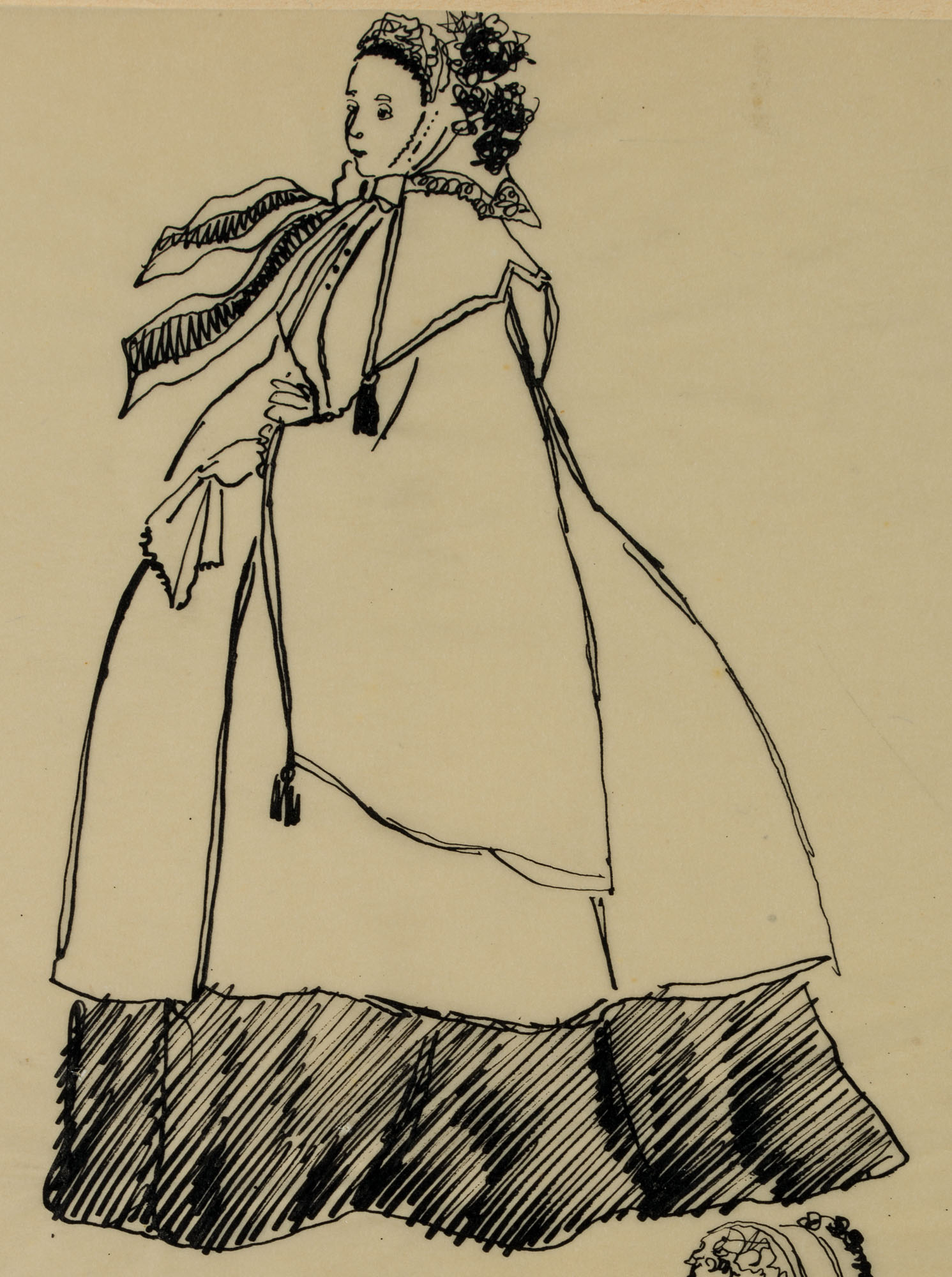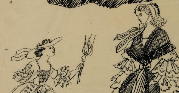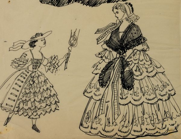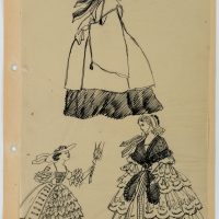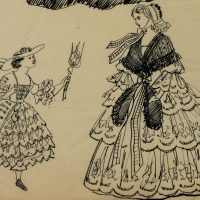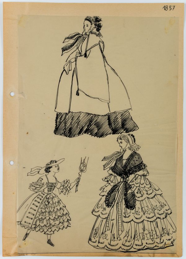 The drawings were partly made for the publication “150 Jahre Weltgeschichte für die Dame. Nach zeitgenössischen Berichten und Vorlagen”, which dealt with 19th century fashion. It was published in 1955 under the editorship of Erhard KLEPPER.
