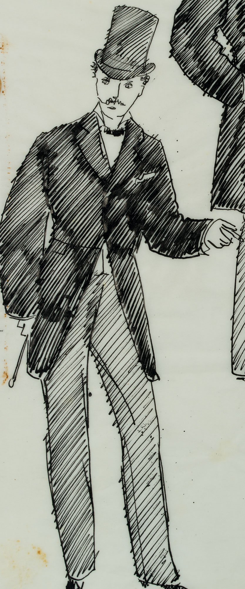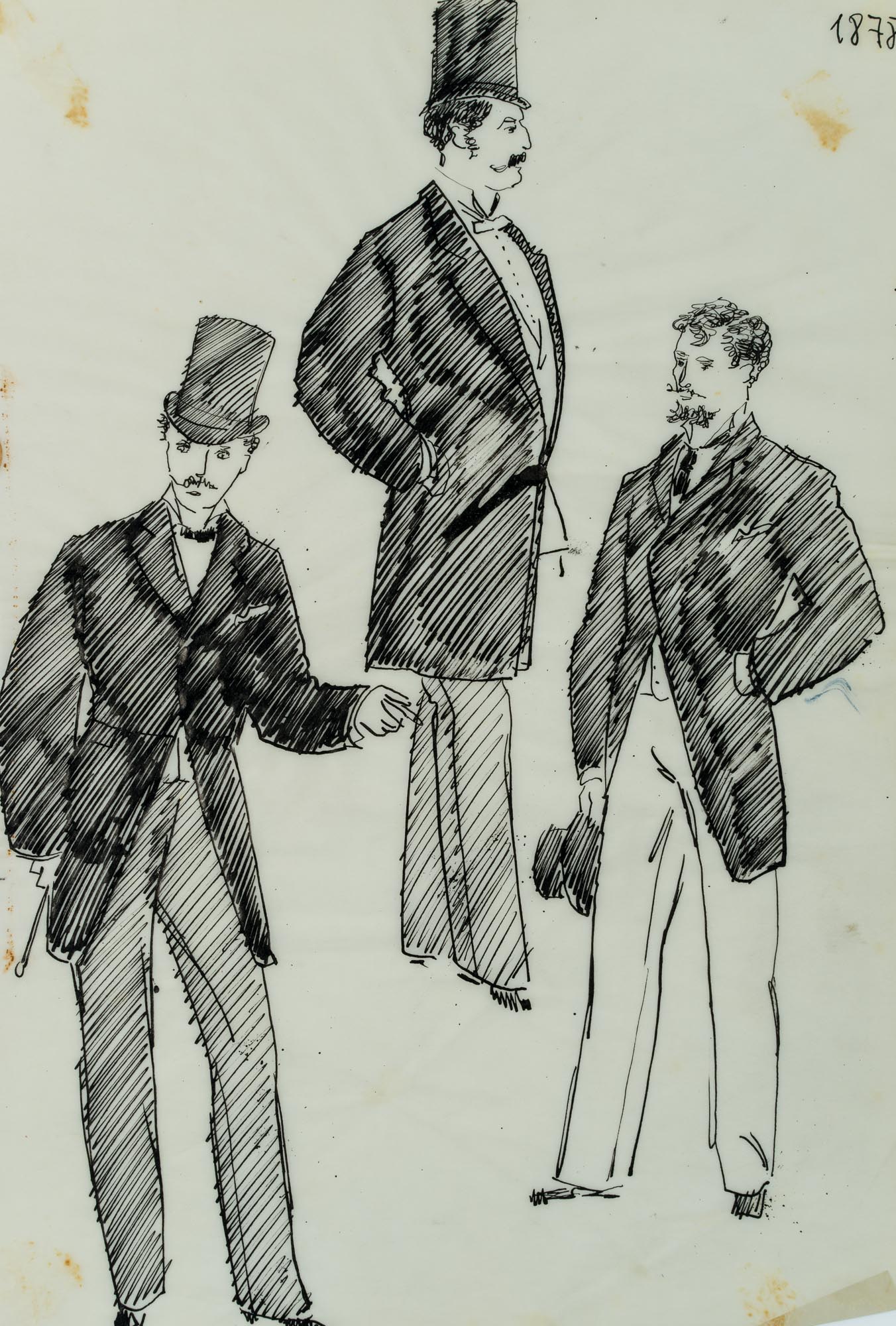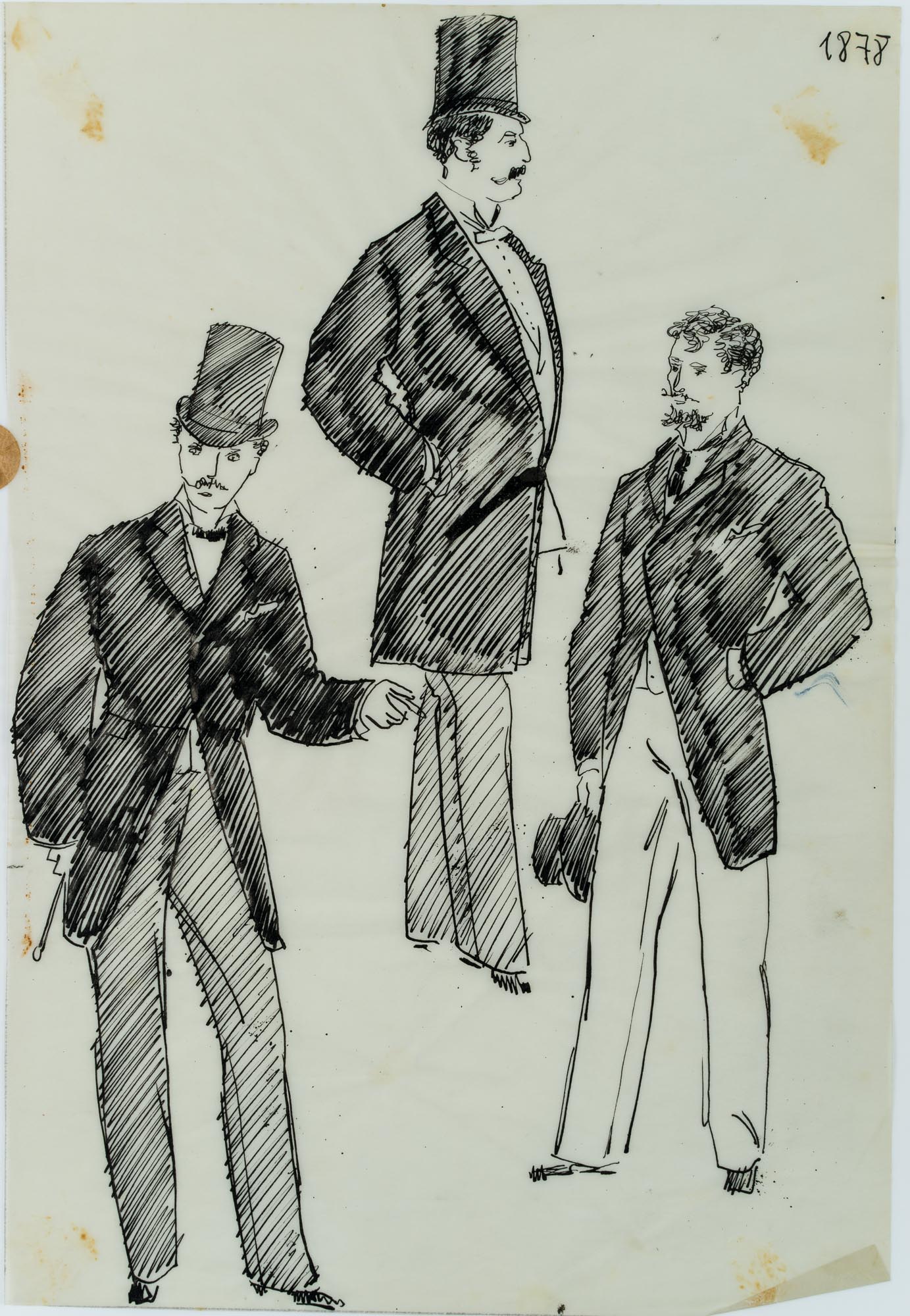Depiction of three bearded men in black, knee-length frock coats, wearing a top hat on their heads or having just pulled it off. They are wearing men’s fashions Although the figures are gathered on one sheet, they hardly seem to come into contact with each other. Only one of the figures, the man in the foreground, turns towards the viewers.