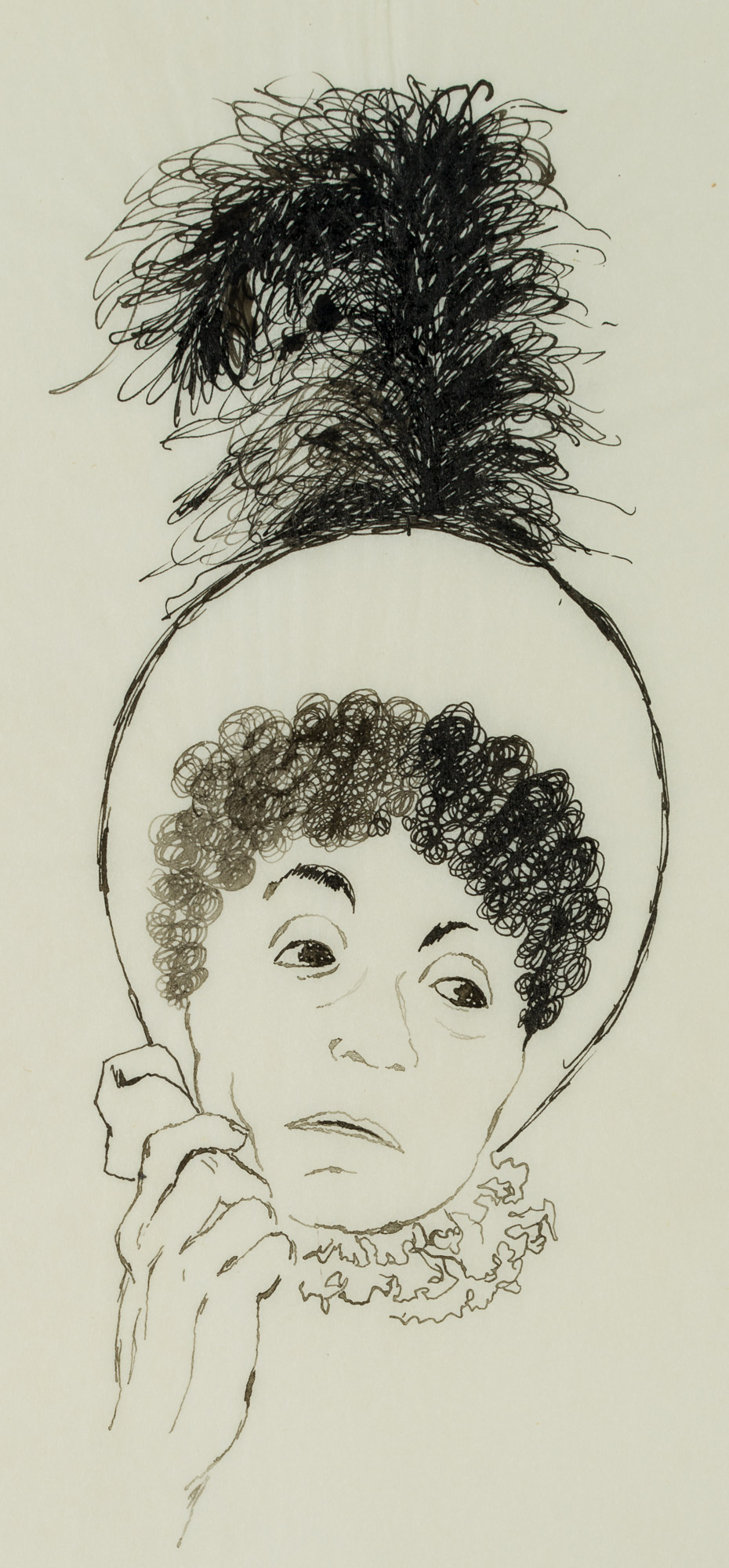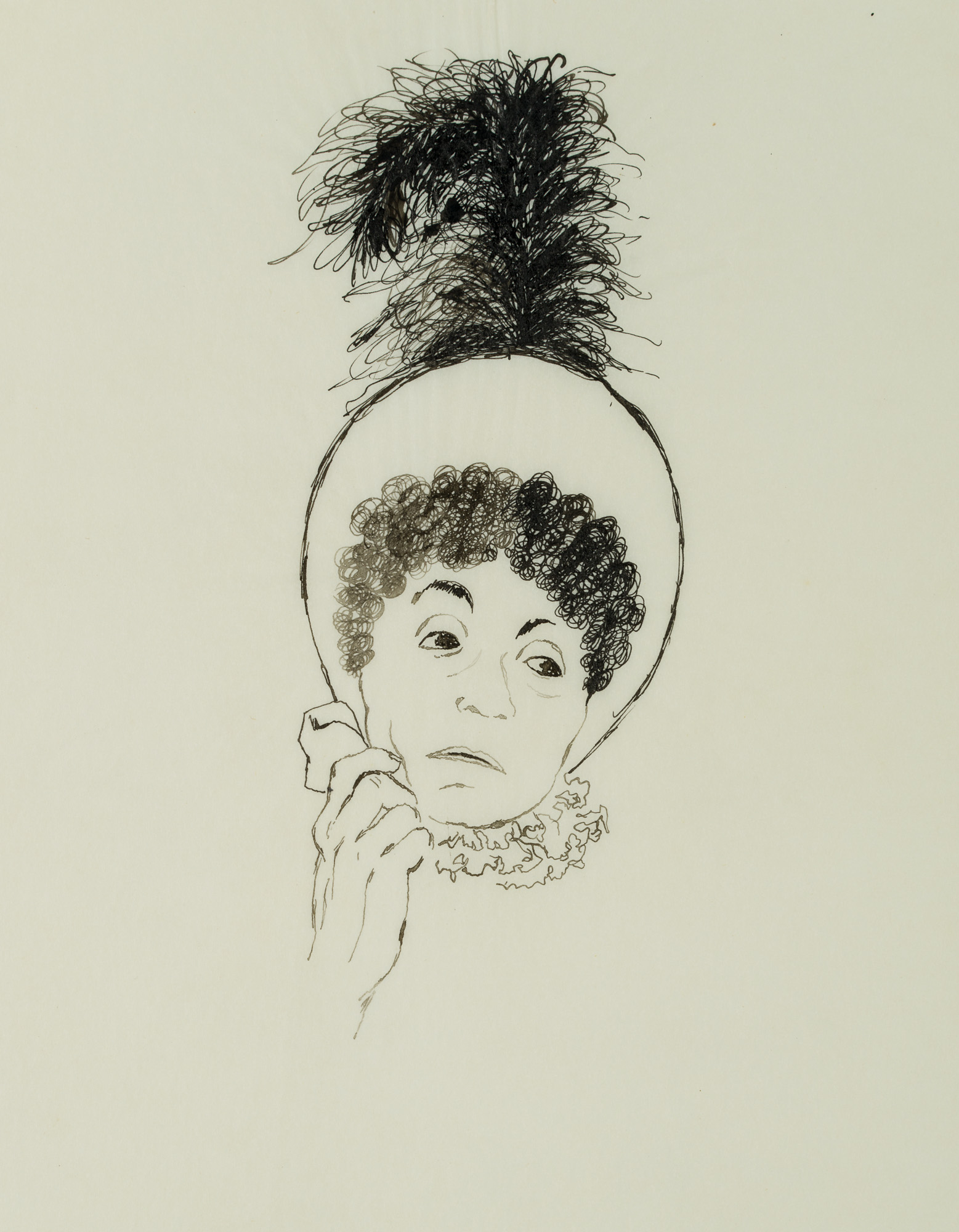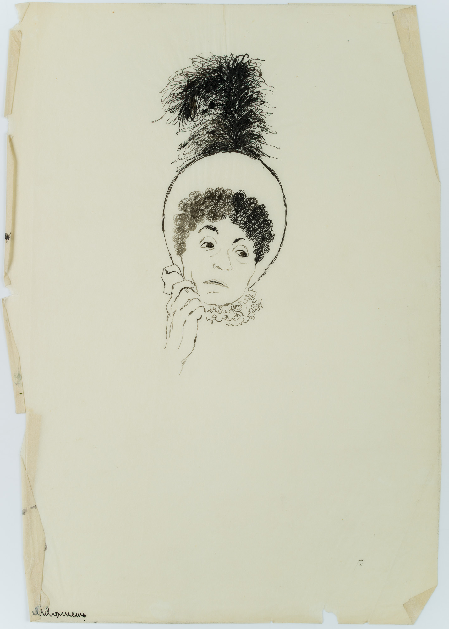 bezeichnet “Mle. Michonneau”.Darstellung einer der Hauptfiguren aus Balzacs Roman “Vater Goriot”. Mademoiselle Michonneau, eine geldgierige Pensionärin ist im Kopfporträt dargestellt. Ein mit einer Feder verziertes Bonnet schmückt ihren Kopf, missmutig hat sie ihren Kopf auf ihre rechte Hand gestützt. “Vater Goriot” entstand im Rahmen von Balzacs Romanzyklus “La Comédie humaine” und gehört zu den “Szenen aus dem Privatleben”. Balzac thematisiert an einem nahezu alle Sozialschichten umfassenden Personenensemble sowohl den gesellschaftlichen Aufstieg als auch dessen Niederungen und Abgründe im Kontext der Restauration des beginnenden 19. Jahrhunderts.