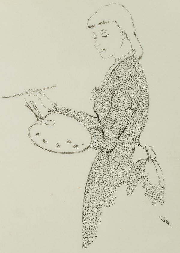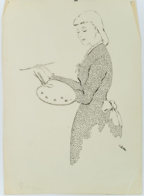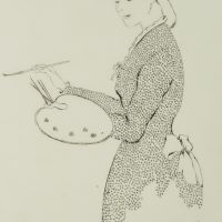 Depiction of one of the main characters from the fairy tale by Hans Christian Andersen. The half-figure portrait shows the elegant countess with brush and palette painting the two plants. Apple blossom branch and dog flower realise that they both have their own beauty despite their different size and shape.