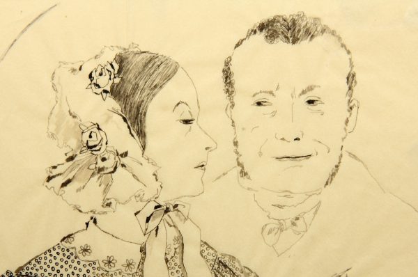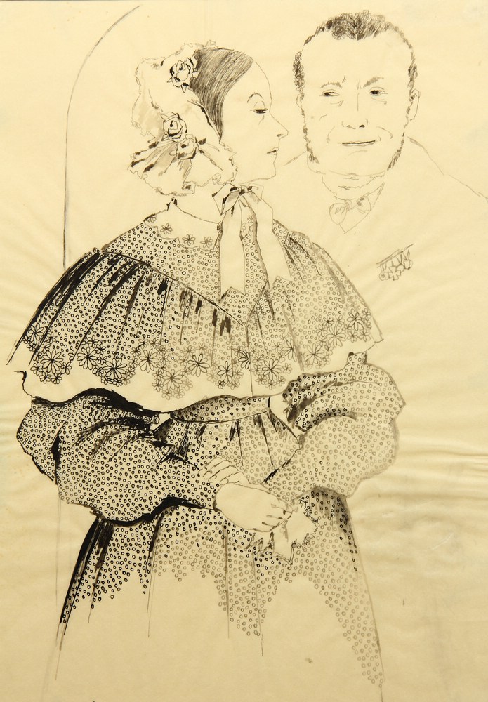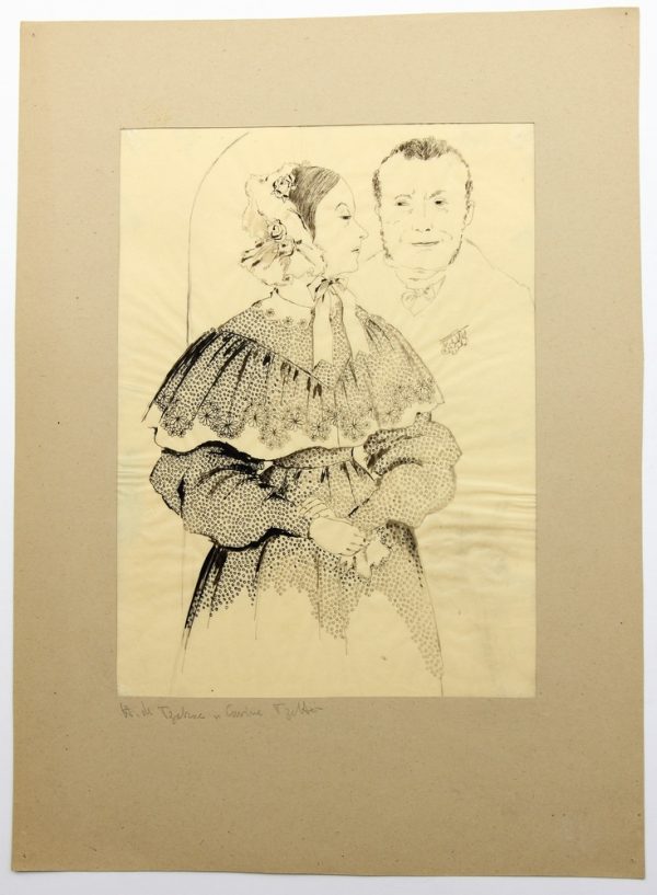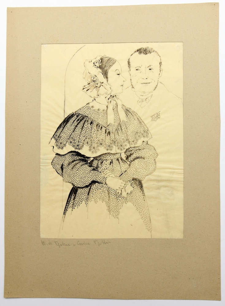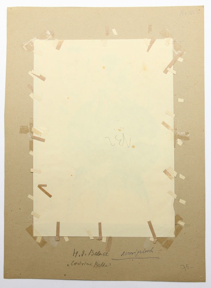 - Description: Portrait of a young woman with a sour expression in a patterned dress, her head turned into profile. Behind her is a bust portrait of a man with aristocratic features and implied military decorations. It is presumably the main characters of the novel Bette Fischer and her widowed brother-in-law Hector Hulot. The illustration comes from the estate of the artist, illustrator and costume draughtsman Erhard Klepper and belongs to a whole series of novel illustrations. Please also note our further offer. The title of the illustration is written by the artist himself in pencil on the passe-partout. On the reverse side of the sheet, as well as on the passepartout, is the number 132. In addition, there are further pencil markings as well as the probably later comment: “unsigned”.