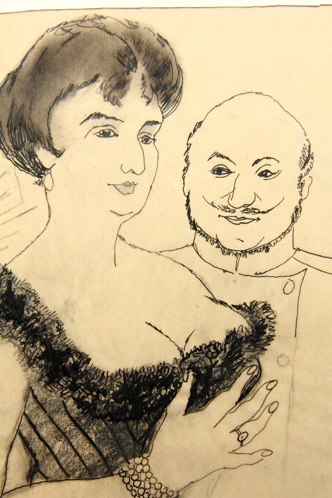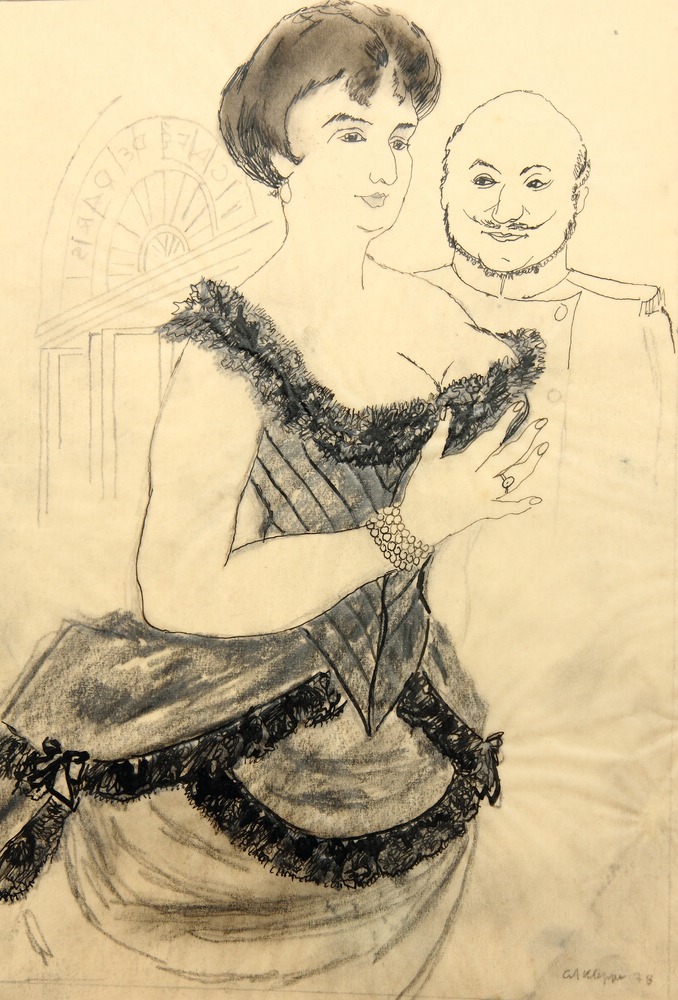 - Description: Half-length portrait of an elegant lady in a provocative dress with deep décolleté and noble jewellery. Next to her is a gentleman in military dress with a moustache. The entrance to the “Café de Paris” can be seen in the background. The illustration comes from the estate of the artist, illustrator and costume draughtsman Erhard Klepper and belongs to a whole series of novel illustrations. Please also note our further offer.