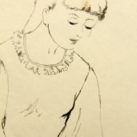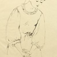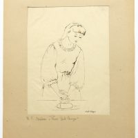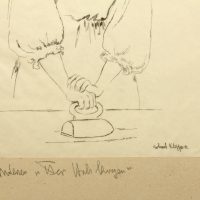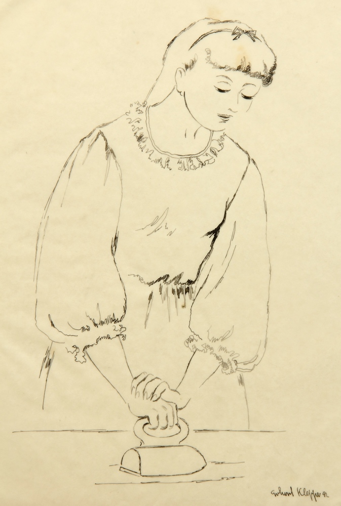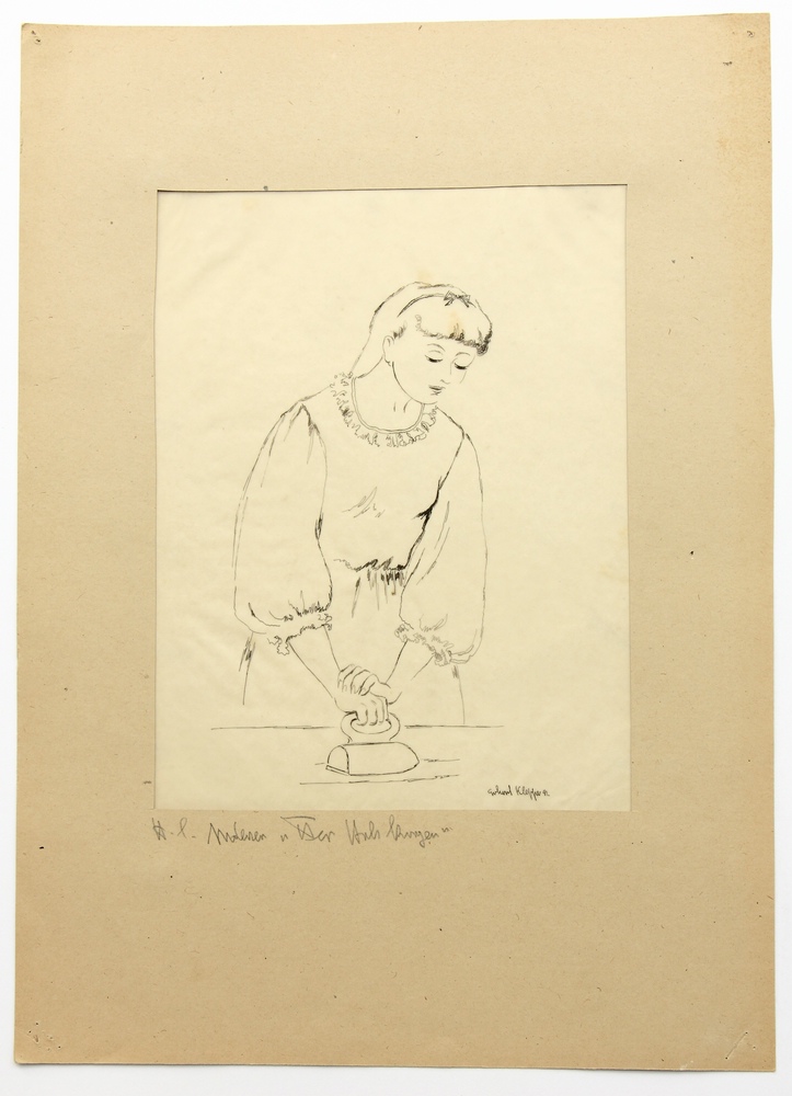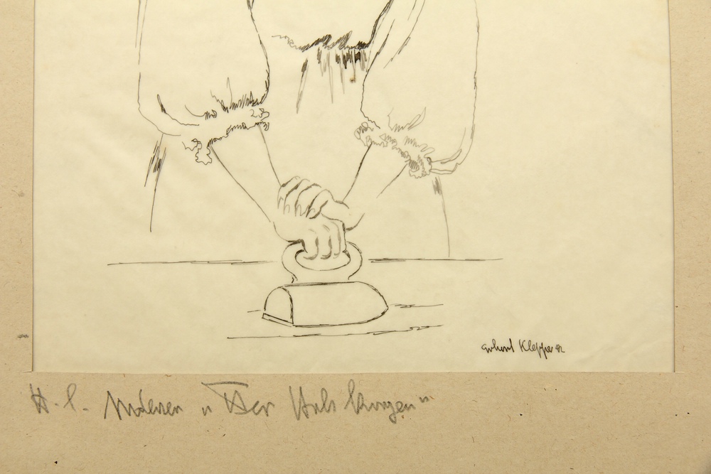 - Description: Depiction of a character from the fairy tale by Hans Christian Andersen (1805 Odense – 1875 Copenhagen) from a collection of 1847. Depicted in a half-figure portrait is a young girl ironing a collar. The latter – endowed with human-like features – is depicted as a virtuous braggart who is punished at the end of the story by being turned into paper and having the short story about him written on him. The illustration comes from the estate of the artist, illustrator and costume draughtsman Erhard Klepper and is the 6th motif from a series of fairy tale illustrations on Hans Christian Andersen. Please also note our further offer.