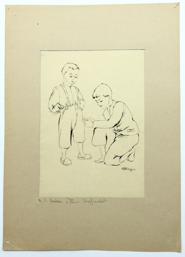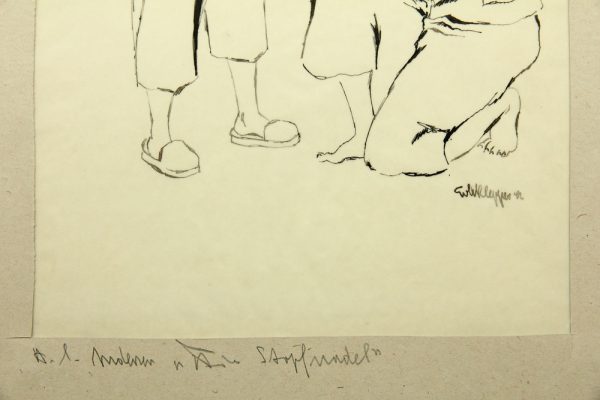 - Bezeichnung: Unten rechts befindet sich die Signatur des Künstlers sowie eine Datierung auf [19]47[?]. Auf dem Passepartout ist vom Künstler eigenhändig der Titel der Darstellung in Bleistift angebracht. Rückseitig sind mit Bleistift und Kugelschreiber diverse Nummerierungen aufgetragen.