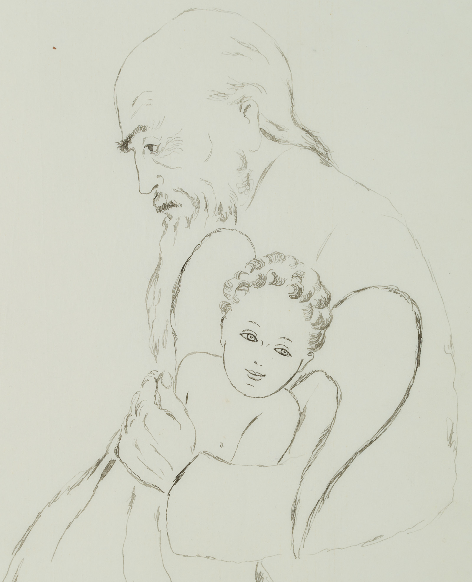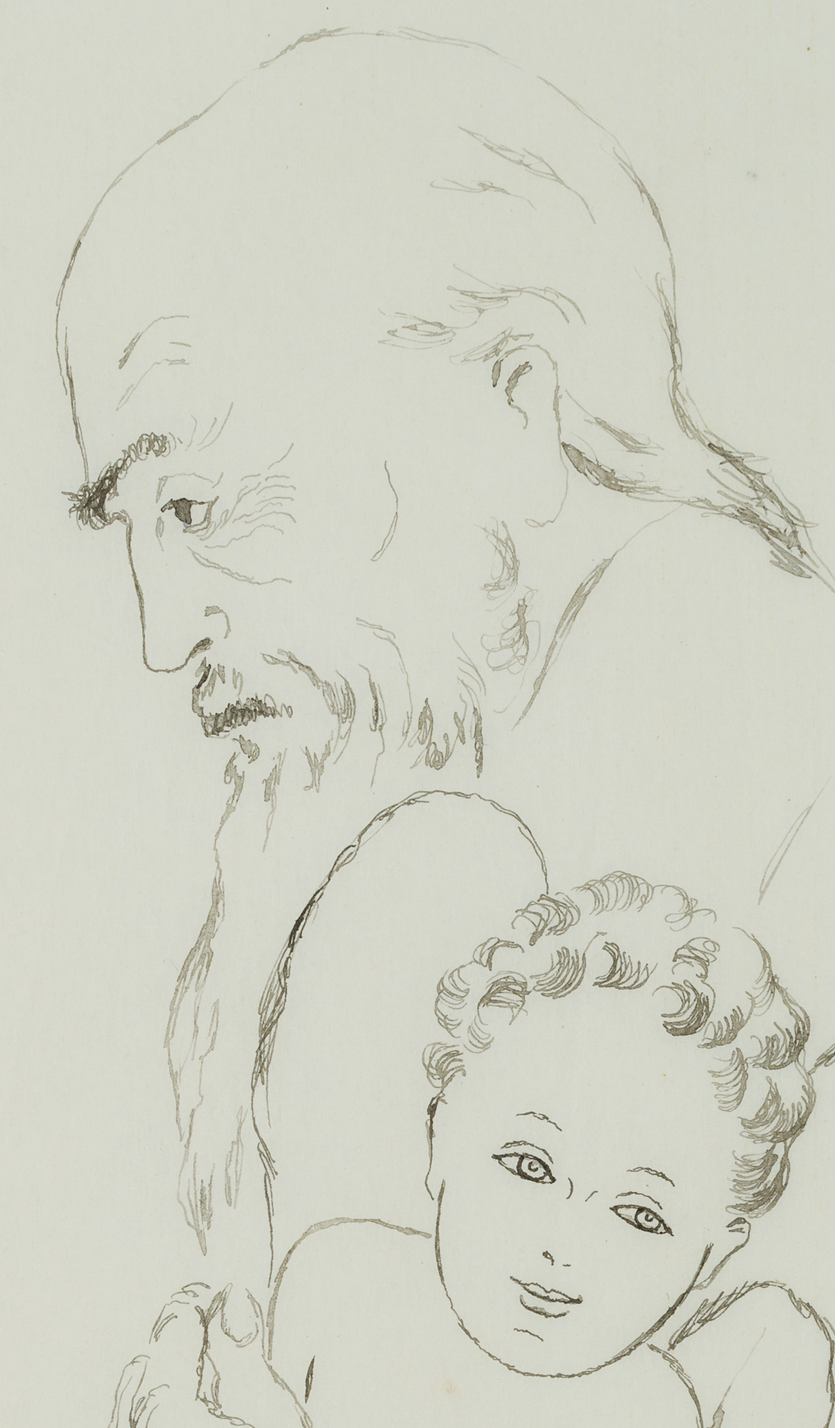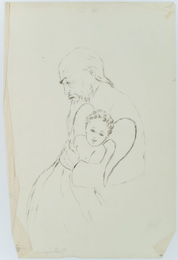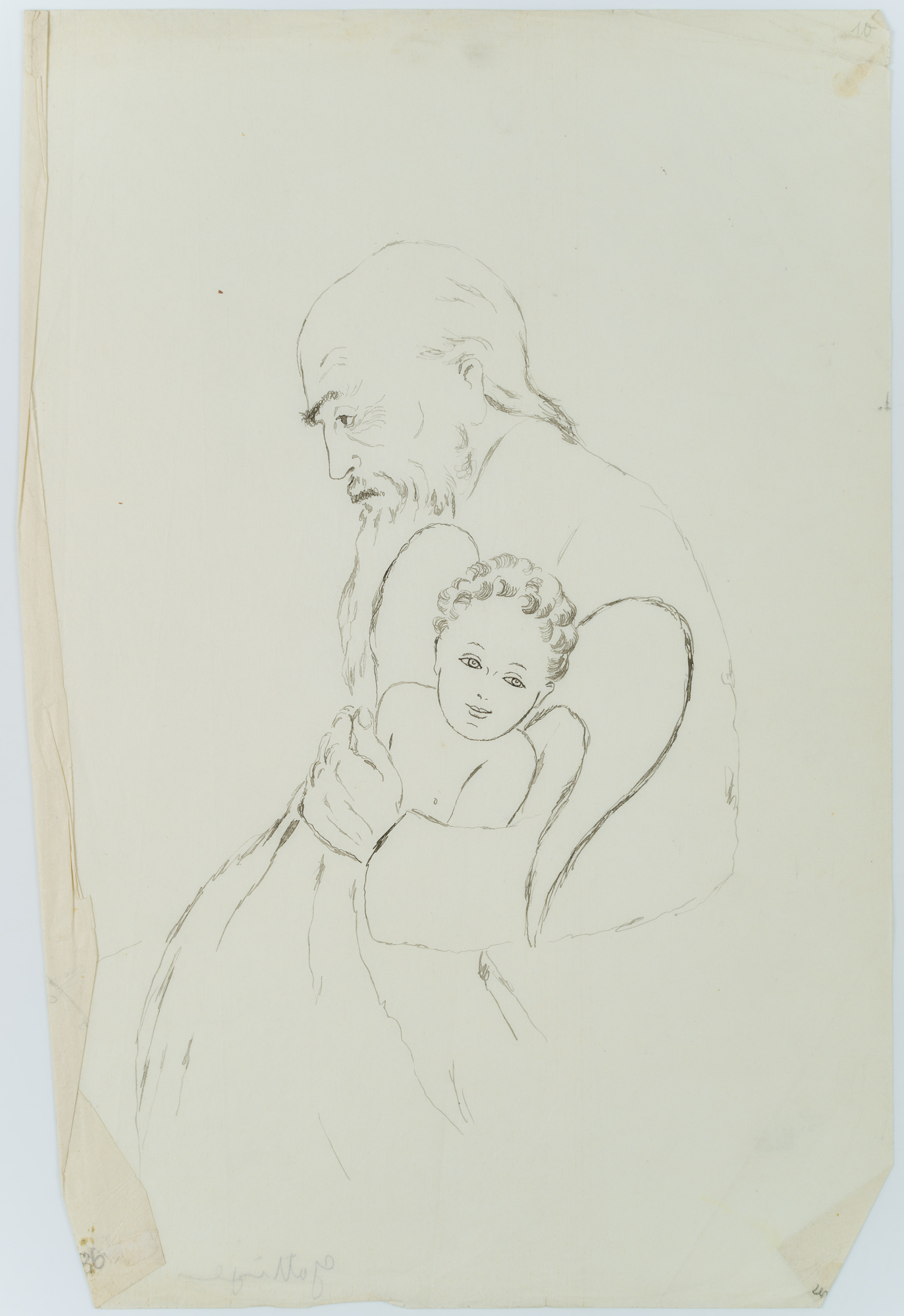 In the portrait format of the picture, the viewer encounters the depiction of an older man in profile. His face is furrowed, he looks out of the picture space with a grim expression. Under his left arm, the man carries a child whose wings reveal him to be an angel.