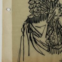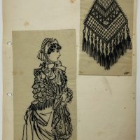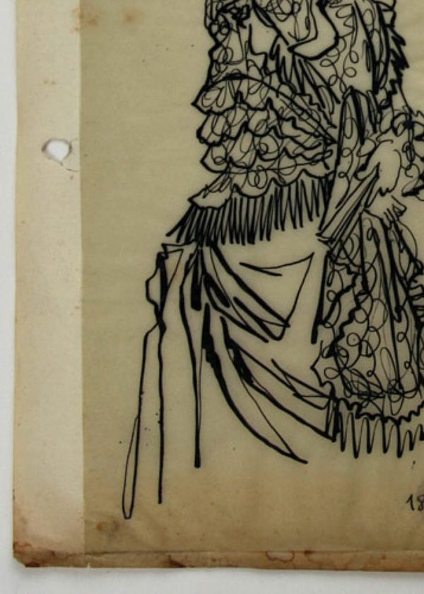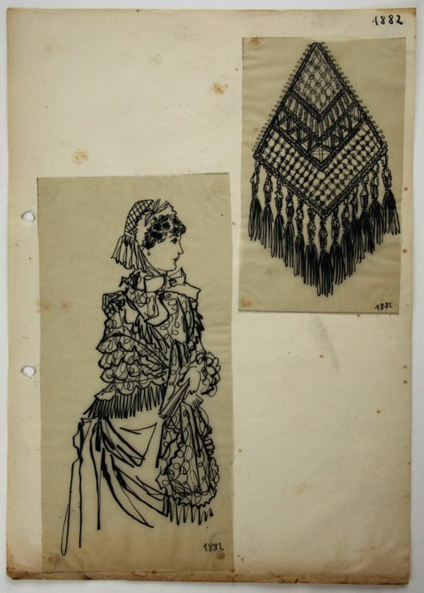 - Description: Erhard Klepper, Fashion study/ Lady with shawl and bonnet from 1882, two hand drawings, pen and ink in black on parchment paper, around 1950. Description: Pen and ink in black on parchment paper. Inscribed on both drawings lower right: “1882”. Very nice drawing of a young lady in profile with a gathered skirt and a striking shawl. On her black hair she wears a matching bonnet. The second drawing is dedicated to the spread out shawl. The elaborate crochet work can be beautifully studied here. Erhard Klepper (Beuthen 1906 ? Berlin 1980), wrote numerous books on the history of fashion and illustrated them with his own drawings; his aim was to capture clothing together with its accessories. Among other things, Klepper was the editor of the books “Die Mode des 18. Jh. ” and “150 Jahre Weltgeschichte für die Dame. Compiled from contemporary reports and models 1801-1950” (first edition Herbig Verlagsbuchhandlung Berlin 1955, 223 pages with numerous fashion drawings by Erhard Klepper).