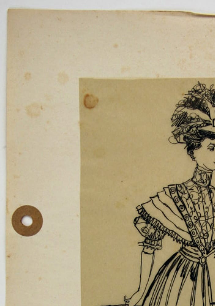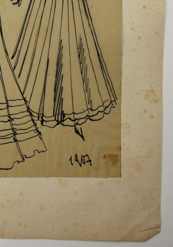 • Description: Erhard Klepper, Modesstudie / Two Ladies with Feather Hats from 1907, pen and ink in black, c. 1960. Description: Pen and ink in black on parchment paper. Inscribed lower right: “1907”. Very nice drawing of two elegant ladies in long, flowing dresses and feather hats. Erhard Klepper (Beuthen 1906-Berlin 1980), wrote numerous books about the history of fashion and illustrated them with drawings by his own hand, his aim was to capture the clothes together with their accessories. Among other things, Klepper was the editor of the books “Die Mode des 18. Jh. ” and “150 Jahre Weltgeschichte für die Dame. Compiled from contemporary reports and models 1801-1950” (first edition Herbig Verlagsbuchhandlung Berlin 1955, 223 pages with numerous fashion drawings by Erhard Klepper).