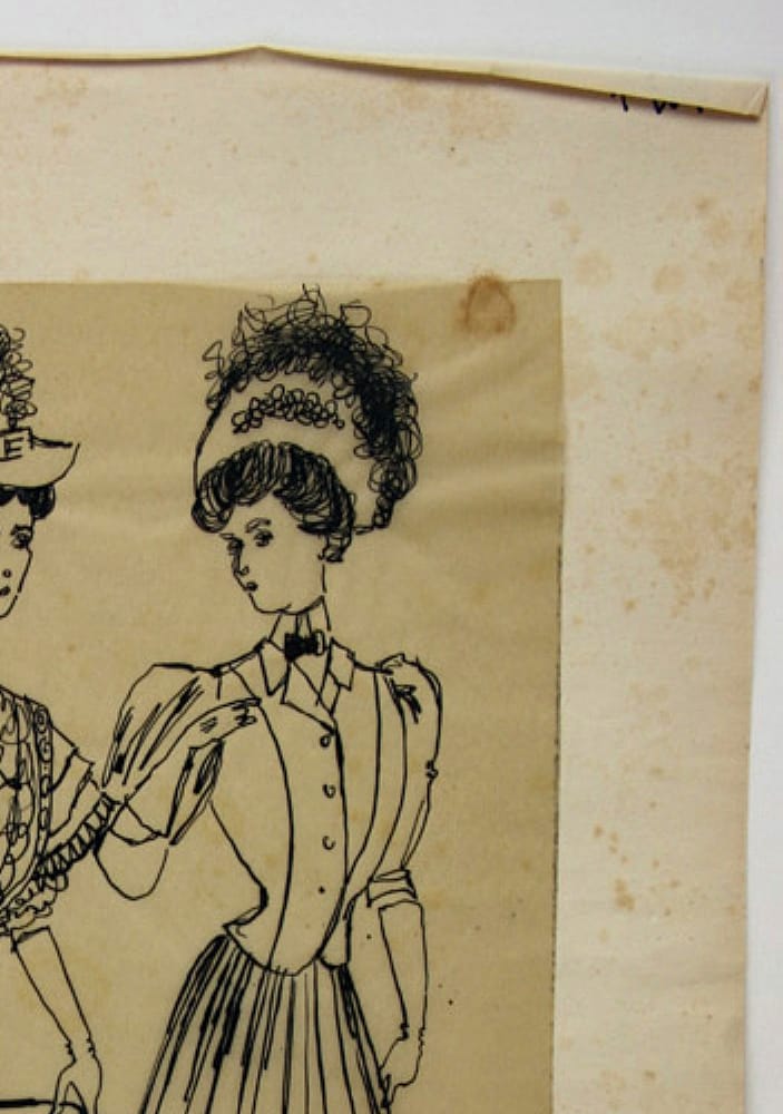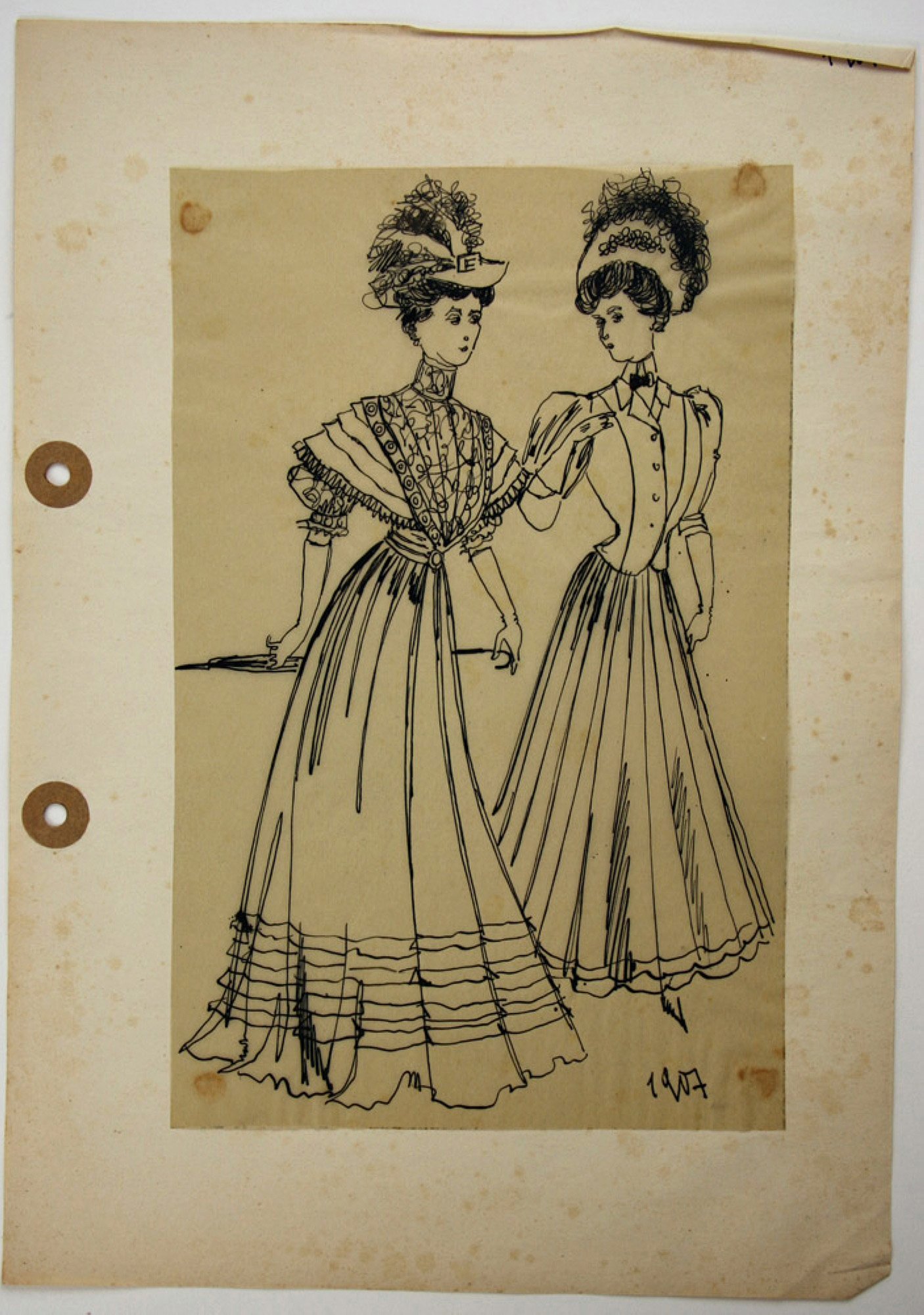 Erhard Klepper, Modesstudie / Zwei Damen mit Federhüten von 1907, Feder in schwarz, um 1960. Beschreibung: Feder in schwarz auf Pergamentpapier. Bezeichnet unten rechts: “1907”. Sehr schöne Zeichnung zweier eleganter Damen in langen, fließenden Kleidern und Federhüten. Erhard Klepper (Beuthen 1906-Berlin 1980), schrieb zahlreiche Bücher zur Geschichte der Mode und illustrierte sie mit eigenhändigen Zeichnungen, sein Ziel war es, die Kleidung samt ihrer Accessoires festzuhalten. U. a. war Klepper Herausgeber der Bücher “Die Mode des 18. Jh. ” und “150 Jahre Weltgeschichte für die Dame. Nach zeitgenössischen Berichten und Vorlagen 1801-1950 zusammengestellt” ( Erstausgabe Herbig Verlagsbuchhandlung Berlin 1955, 223 Seiten mit zahlreichen Mode-Zeichnungen von Erhard Klepper).