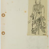 Modestudie einer elegant gekleideter Damen. Sie ist ganz in der Manier des ausgehnden 19. Jahrhunderts gekleidet. Auf das eng geschnittene Oberteil mit reichen Verzierungen und einem Spitzenkragen folgt ein weiter Rock. Das Kleid mit Schoßteile weist an den Säumen Volants und Schmuckschließen auf und betont so den engen Schnitt des Kleider in der Taille zusätzlich.