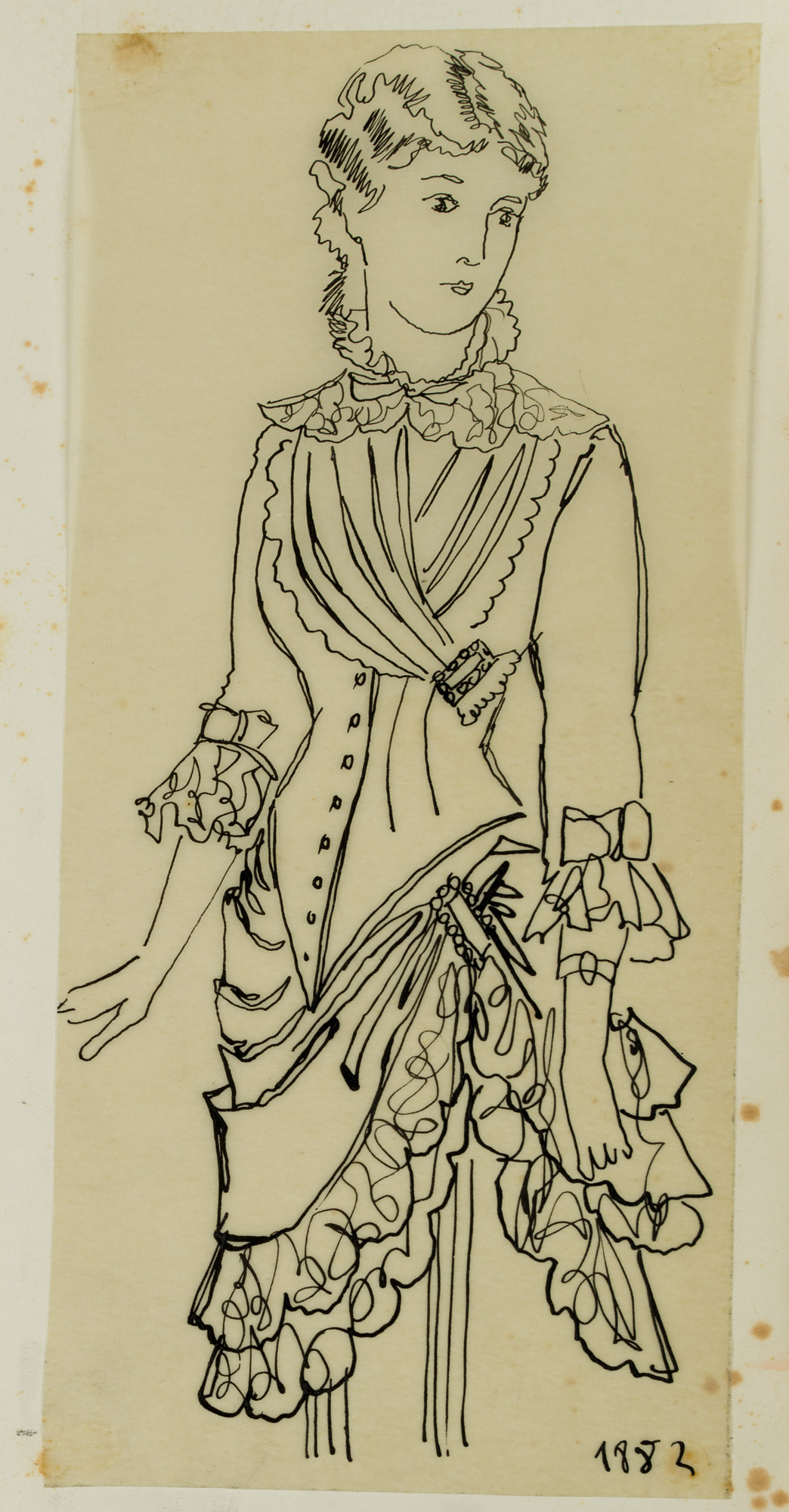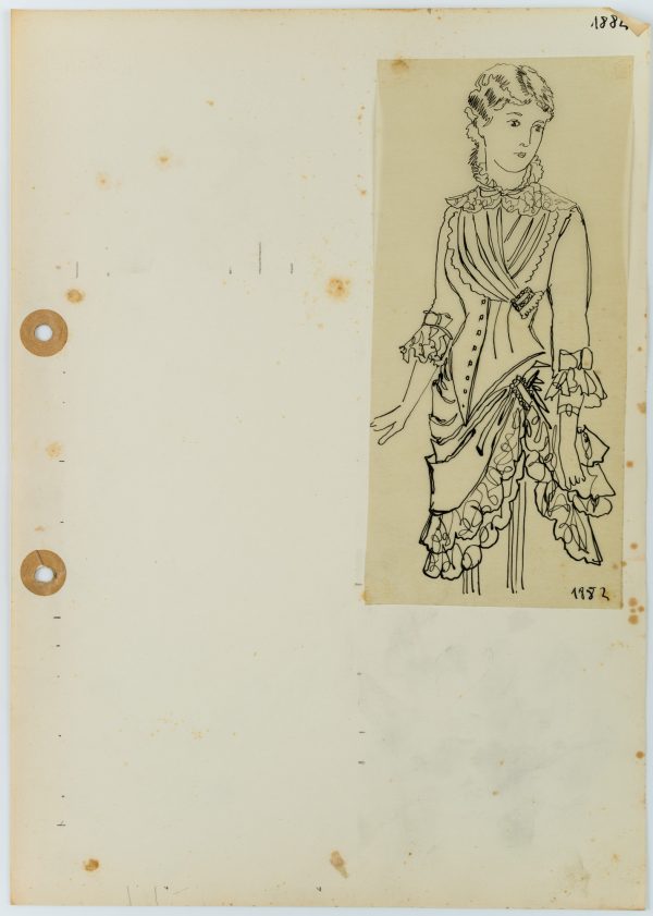 Fashion study of an elegantly dressed lady. She is dressed entirely in the manner of the late 19th century. The tightly cut top with rich ornamentation and a lace collar is followed by a wide skirt. The dress with lap parts features flounces and jewelled clasps at the hems, further emphasising the tight cut of the dress at the waist.