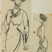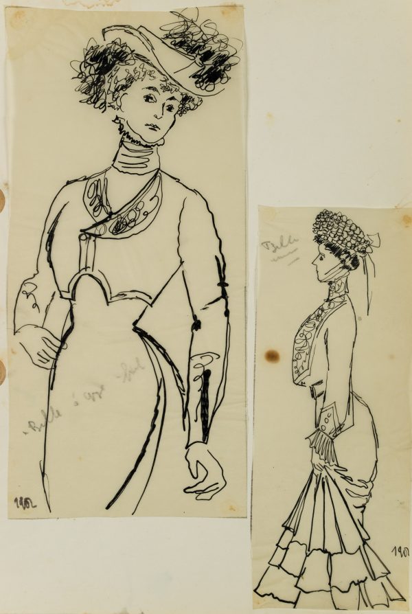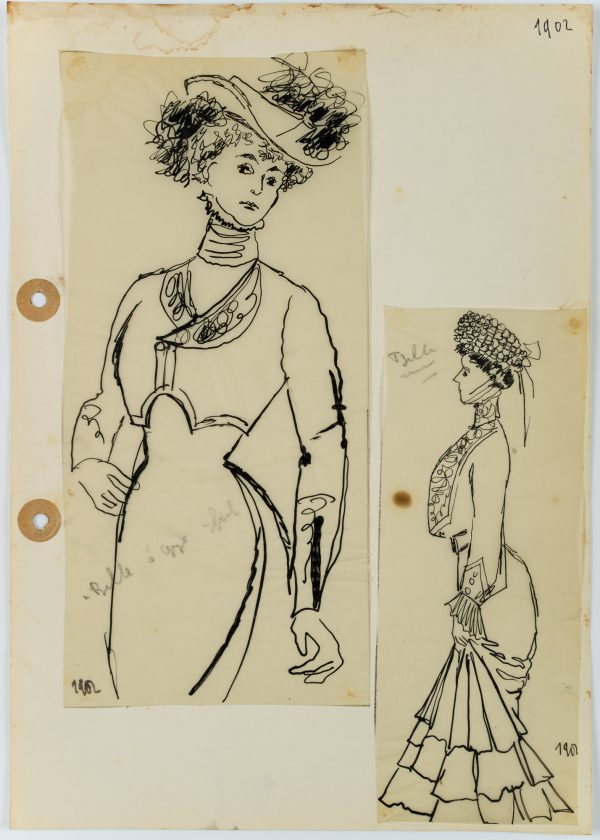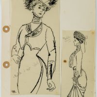 Modestudien zweier elegant gekleideter Damen. Sie sind ganz in der Manier des beginnenden 20. Jahrhunderts gekleidet. Auf eng geschnittene Oberteile folgen weite Röcke, wobei die Taille besonders betont wird. Während eine der Frauen einen Hut mit breiter Krempe und Federschmuck trägt, trägt die andere eine mit Tüll besetzte Haube, die mit einem Band unter ihrem Kinn zusammengebunden ist.