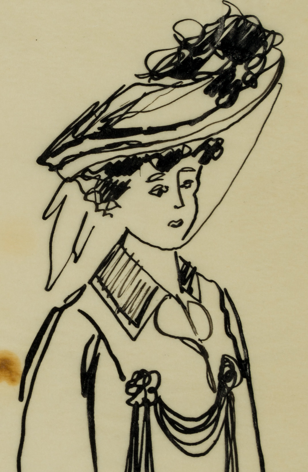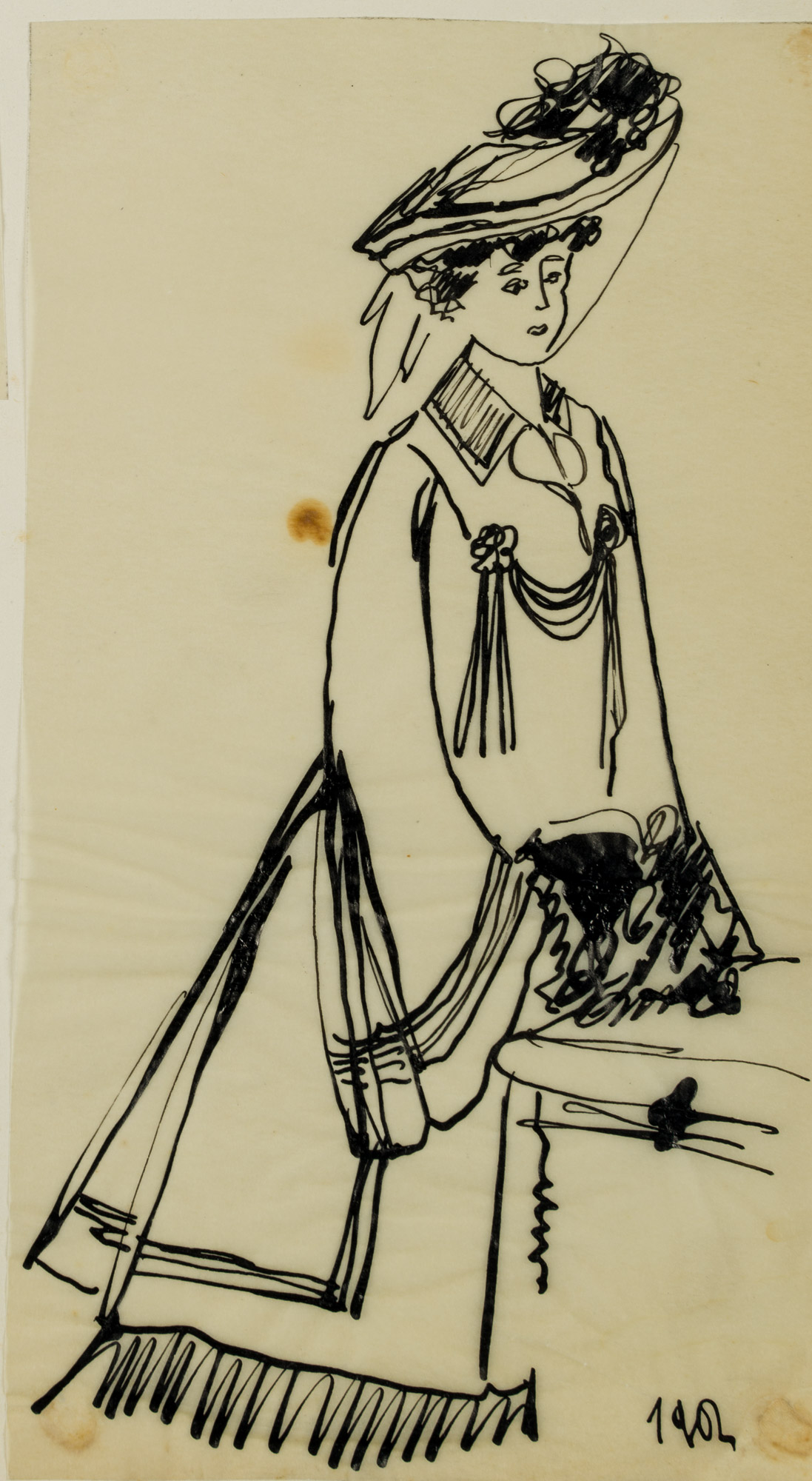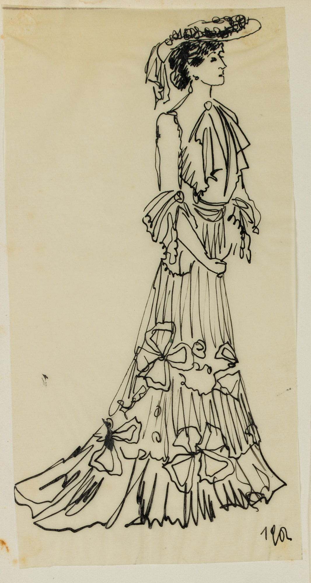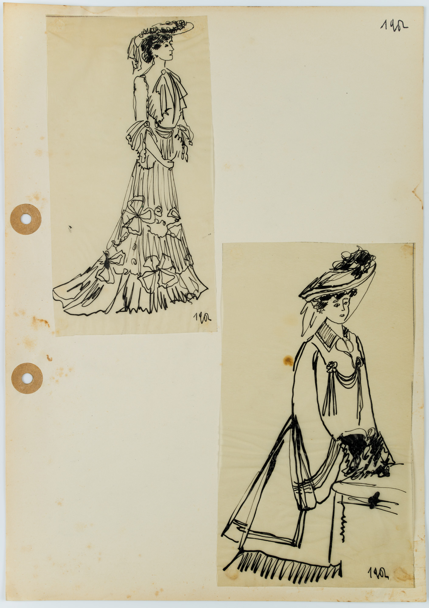 The drawings were partly made for the publication “150 Jahre Weltgeschichte für die Dame. Nach zeitgenössischen Berichten und Vorlagen” (150 years of world history for the lady), which dealt with the fashion of the 19th and early 20th century. It was published in 1955 under the editorship of Erhard KLEPPER.