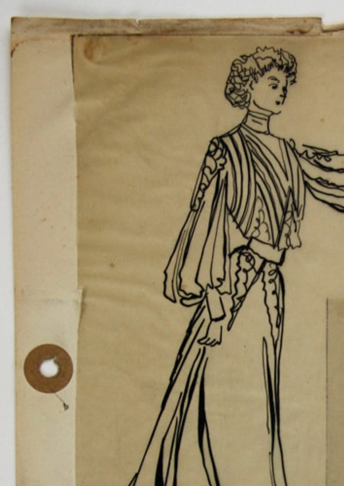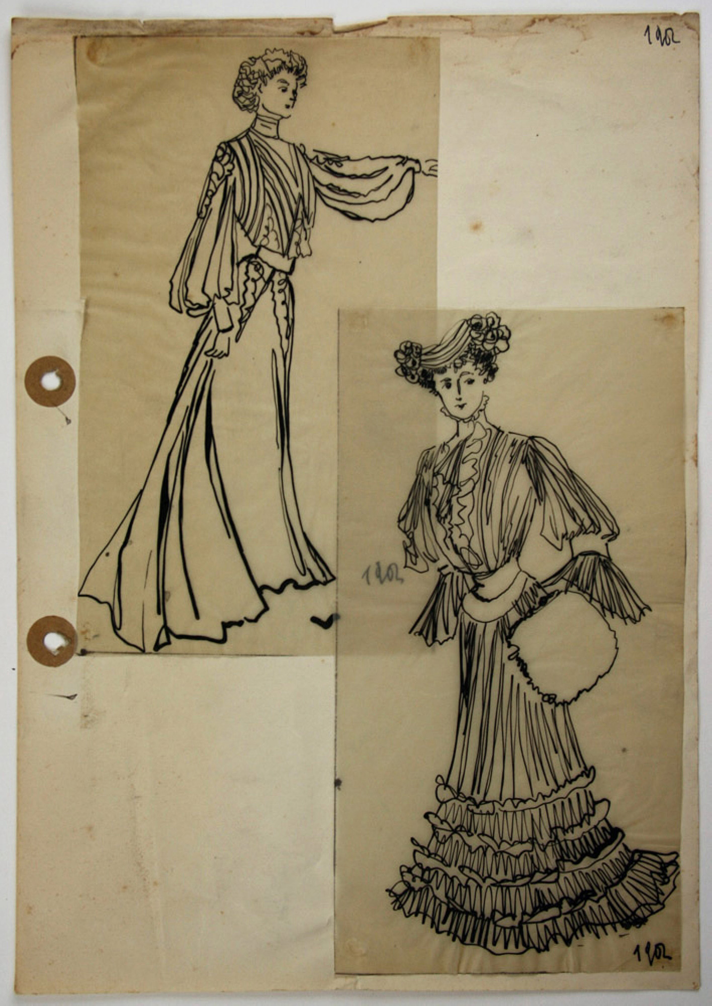 - Beschreibung: Feder in schwarz auf Pergamentpapier. Jeweils bezeichnet unten rechts: “1902”. Auf zwei seperaten Zeichnungen führt der Künstler die Damenmode der Jahrhundertwende vor. Zwei Damen tragen lange, fließende Kleider mit sehr weiten Ärmeln und ausgestellten Röcken. Die Extravaganz der Mode zeigt besonders eine der Damen mit ihrem auffälligen Hut. Erhard Klepper (Beuthen 1906 ? Berlin 1980), schrieb zahlreiche Bücher zur Geschichte der Mode und illustrierte sie mit eigenhändigen Zeichnungen, sein Ziel war es, die Kleidung samt ihrer Accessoires festzuhalten. U. a. war Klepper Herausgeber der Bücher “Die Mode des 18. Jh.” und “150 Jahre Weltgeschichte für die Dame. Nach zeitgenössischen Berichten und Vorlagen 1801-1950 zusammengestellt” ( Erstausgabe Herbig Verlagsbuchhandlung Berlin 1955, 223 Seiten mit zahlreichen Mode-Zeichnungen von Erhard Klepper).