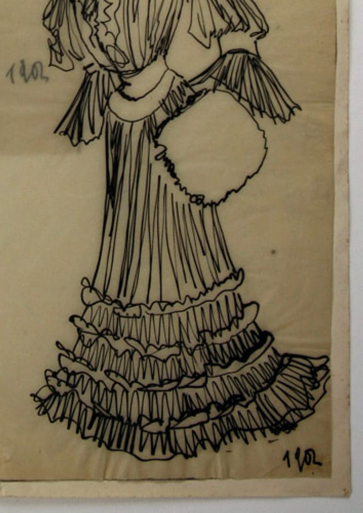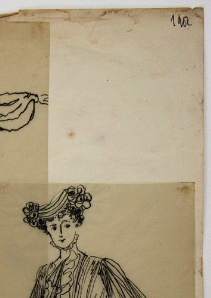 - Description: Pen and ink in black on vellum paper. Each inscribed lower right: “1902”. In two separate drawings the artist demonstrates the women’s fashion of the turn of the century. Two ladies wear long, flowing dresses with very wide sleeves and flared skirts. The extravagance of the fashion is especially shown by one of the ladies with her striking hat. Erhard Klepper (Beuthen 1906 ? Berlin 1980), wrote numerous books on the history of fashion and illustrated them with his own drawings, his goal was to capture the clothes along with their accessories. Among other things, Klepper was the editor of the books “Die Mode des 18. Jh.” and “150 Jahre Weltgeschichte für die Dame. After contemporary reports and templates 1801-1950 compiled” (first edition Herbig Verlagsbuchhandlung Berlin 1955, 223 pages with numerous fashion drawings by Erhard Klepper).