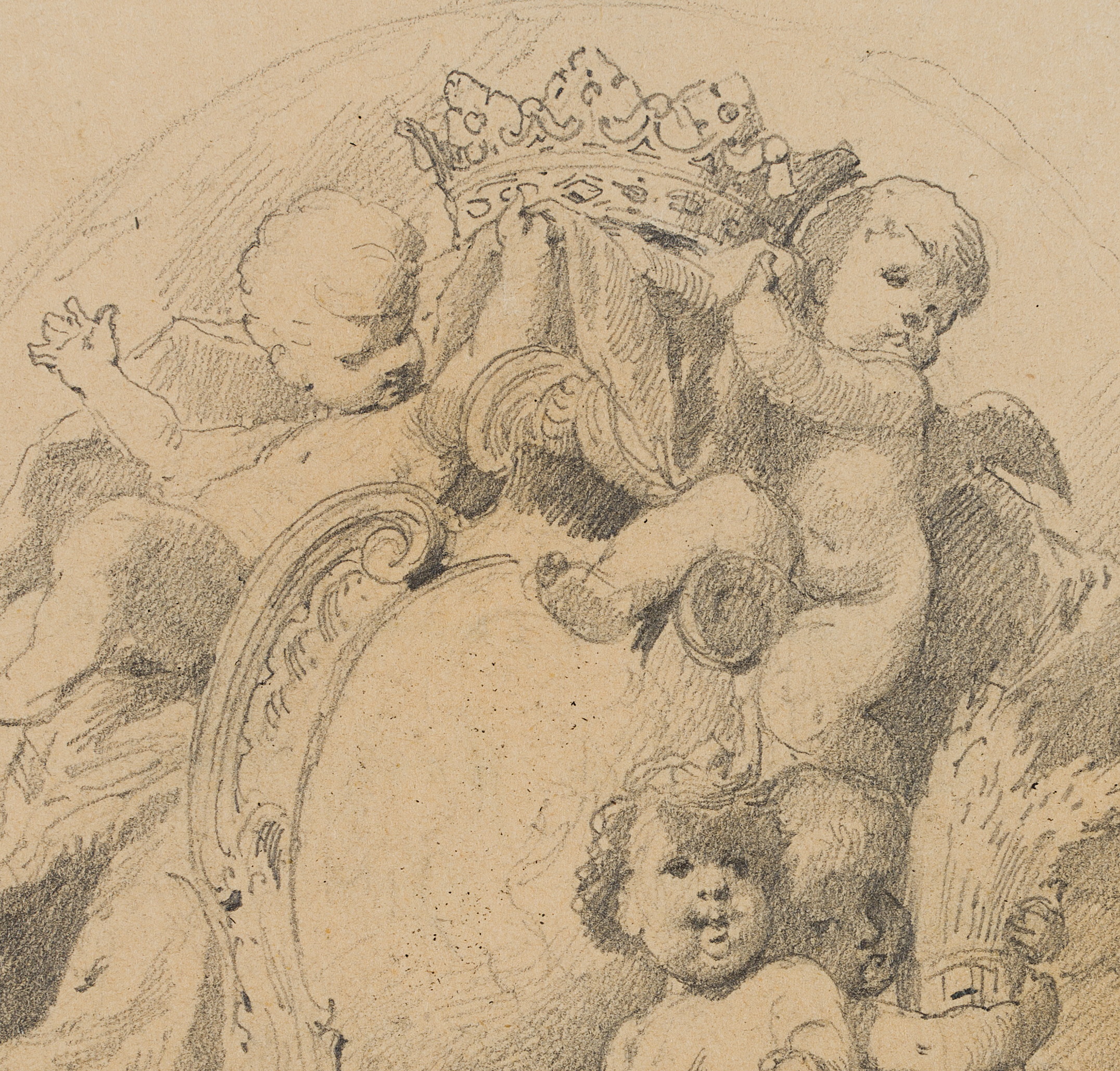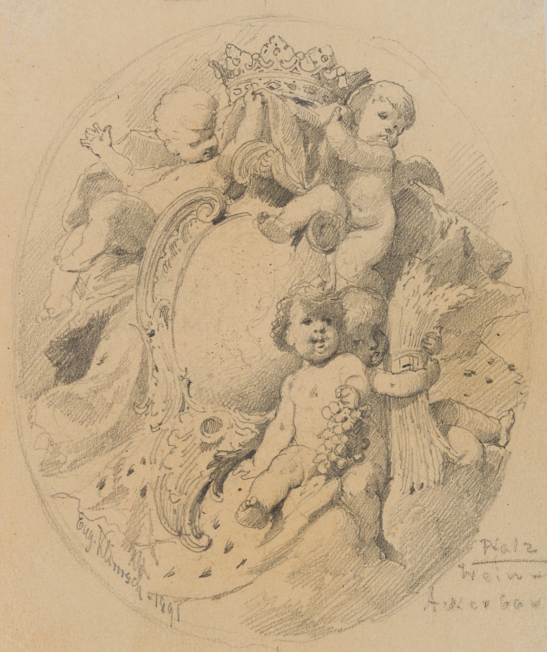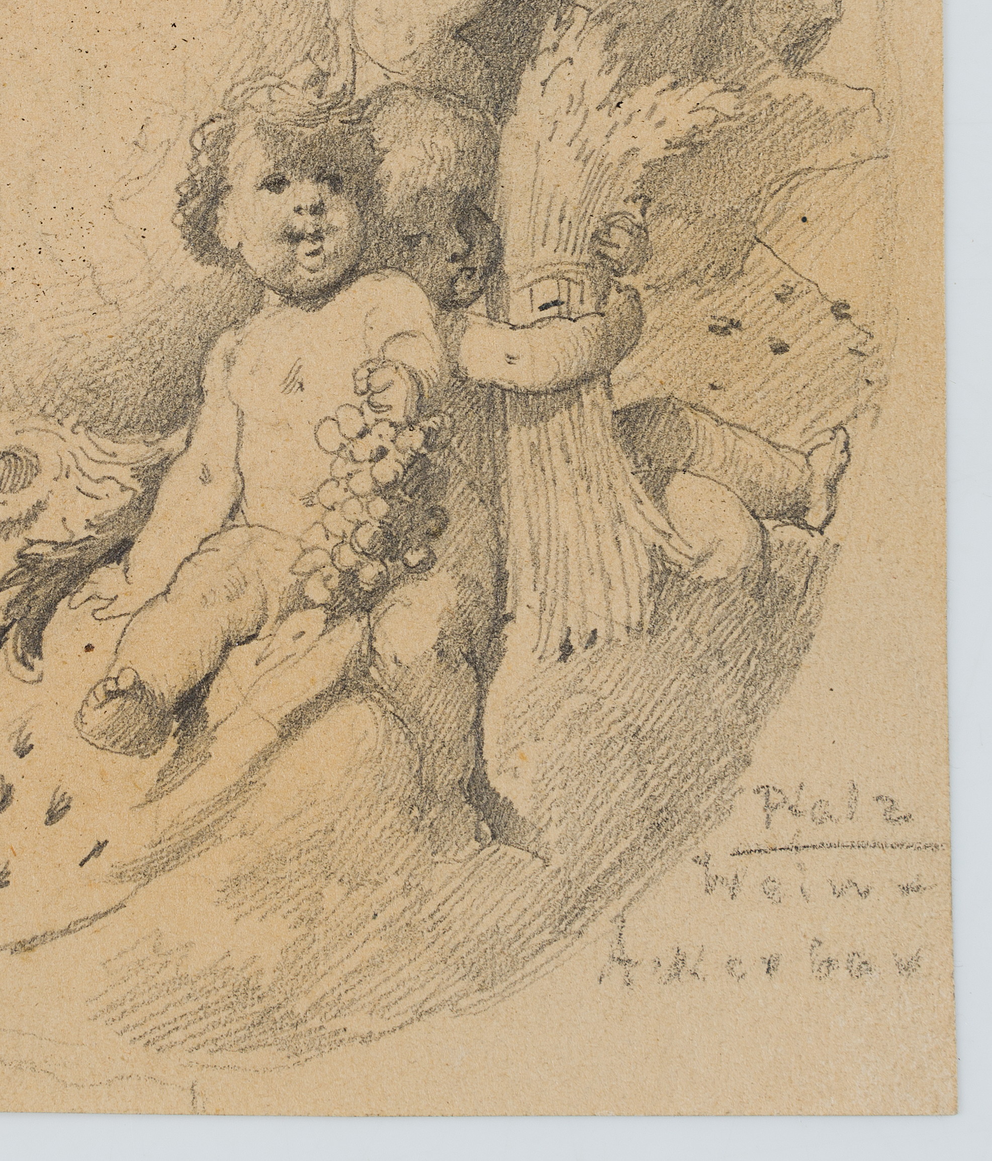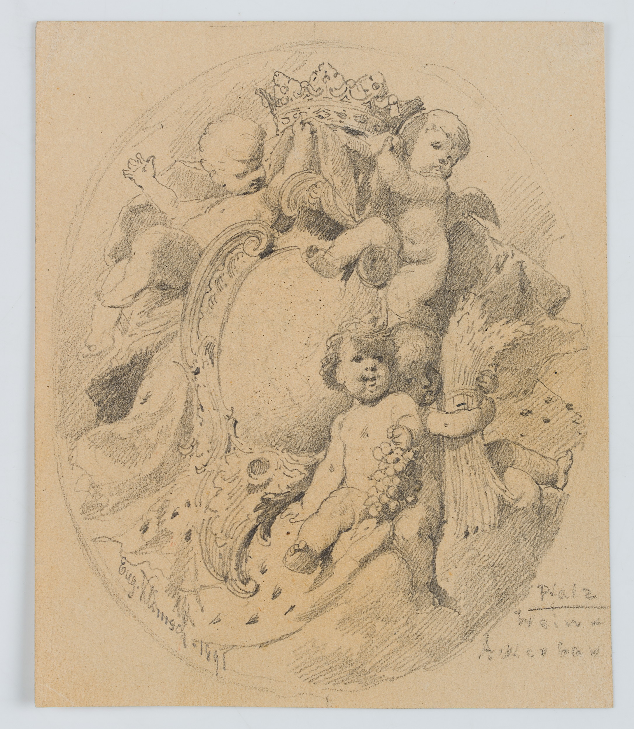 - Beschreibung: Verspielte Putti mit Attributen des Weinbaus und des Ackerbaus um einen Wappenschild im Rokoko-Stil. Als Entwurf für eine Verzierung der Kutsche des Prinzregenten Luitpold von Bayern (1821-1912).