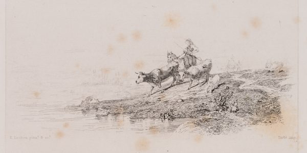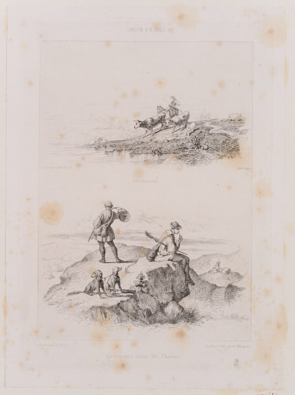 Emile Loubon (1809 Aix – 1863 Marseille), Watering the Cattle, “Abreuvoir” and Charles Edouard ELMERICH (1813 Besancon – 1889 Paris), Hunter in the Mountains, “Le rendez-vous de Chasse”, Salon de 1842, 1842, Etching