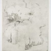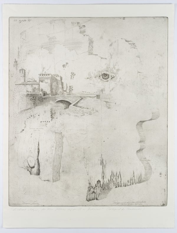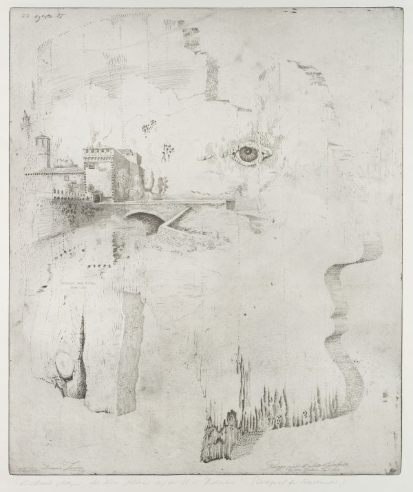 Ernst Wahrmut Mayer (born 1932 Stuttgart), Collage of architecture and man Castello Grottaferrata, 1985, Etching