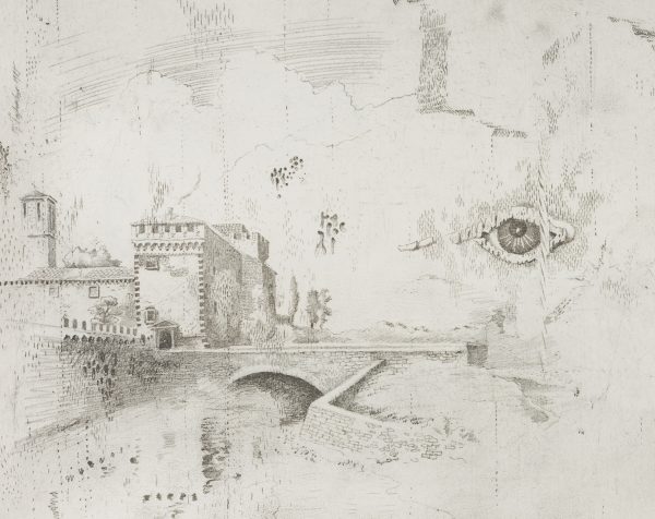 - Beschreibung: Collage aus Landschafts- und Architekturfragmenten. Optische Täuschung mit Seitenprofil eines Gesichtes mit deutlich gekennzeichnetem Auge zu erkennen.