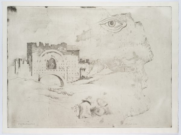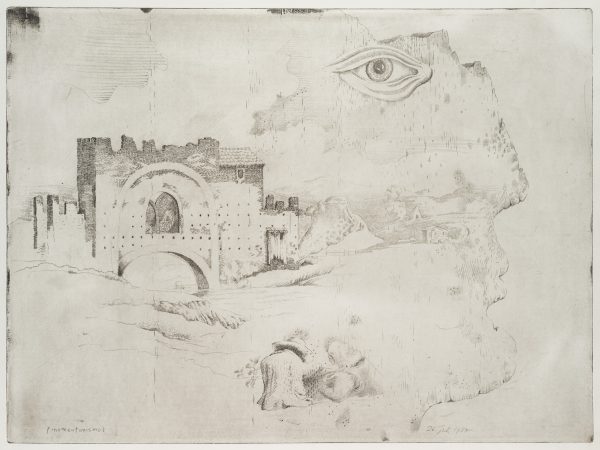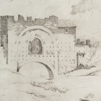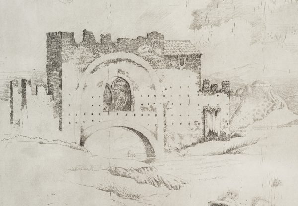 Ernst Wahrmut Mayer (*1932 Stuttgart), “Momentanismo” – Momentaufnahme. Collage Johann Adam Kleins Aquarell der Ponte Nomentano, 1985, Radierung
