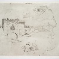 - Beschreibung: Collage aus Elementen von Johann Adam Kleins Aquarell “Ponte Nomentano”. Mit Vexierbild, das zwischen einem Gesicht im Profil und einer Landschaft changiert.