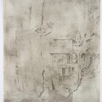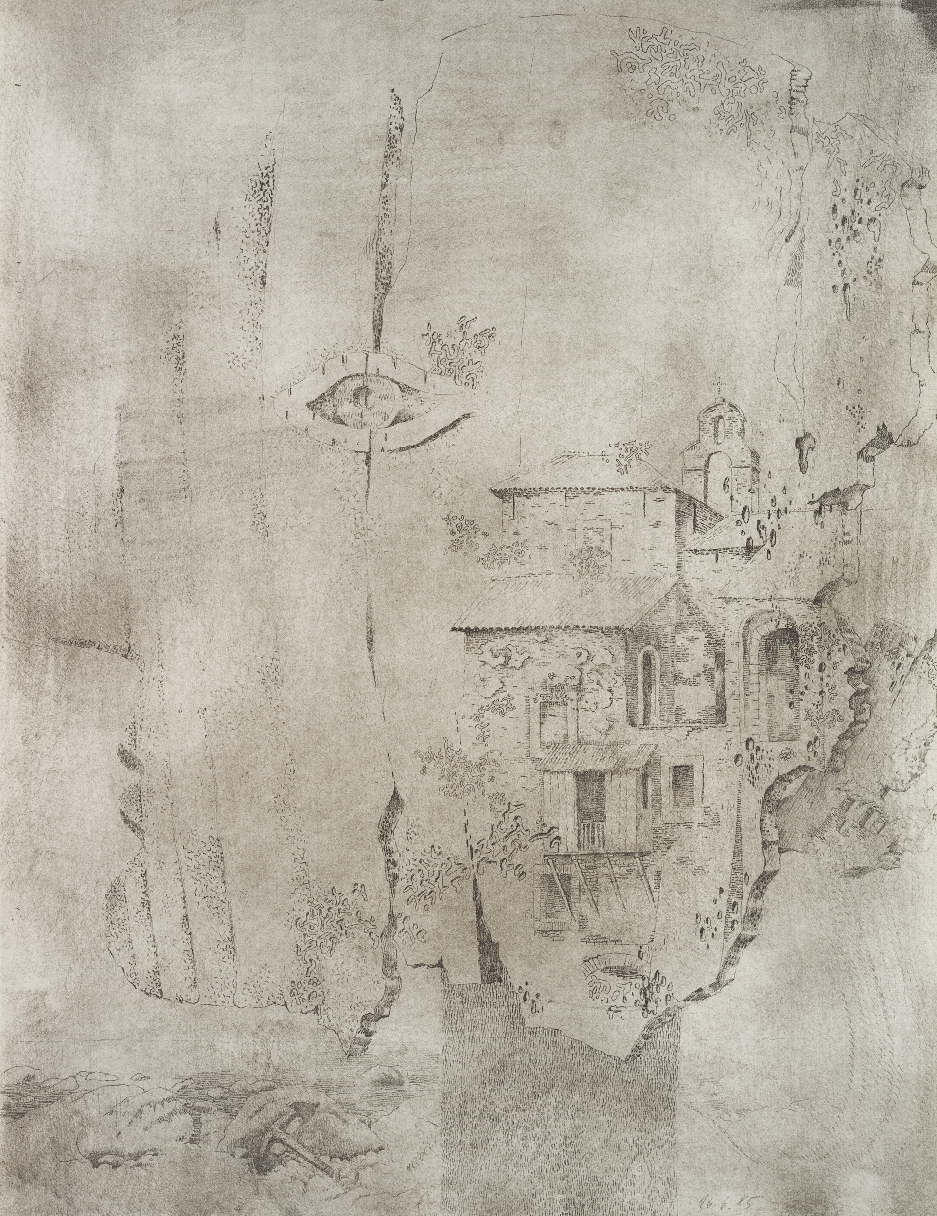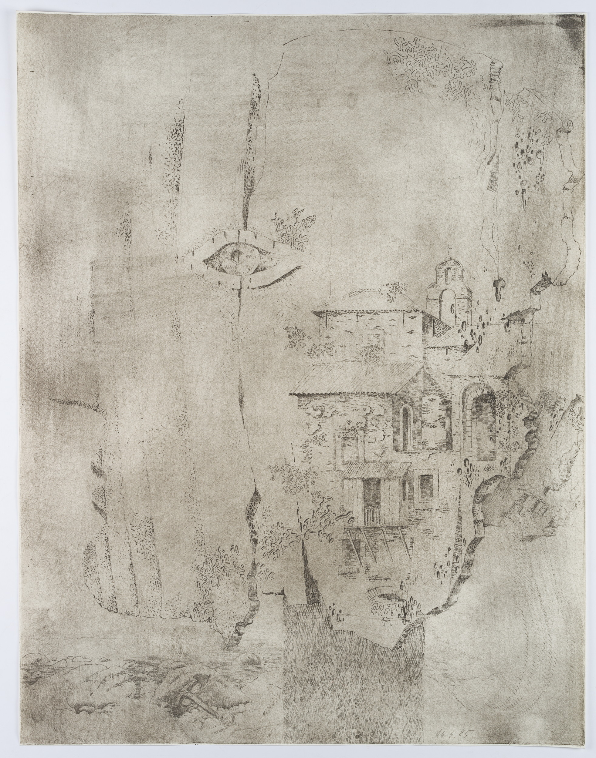 Ernst Wahrmut Mayer (born 1932 Stuttgart), Collage Optical illusion Architectural fragments or face with eye, c. 1985, Etching