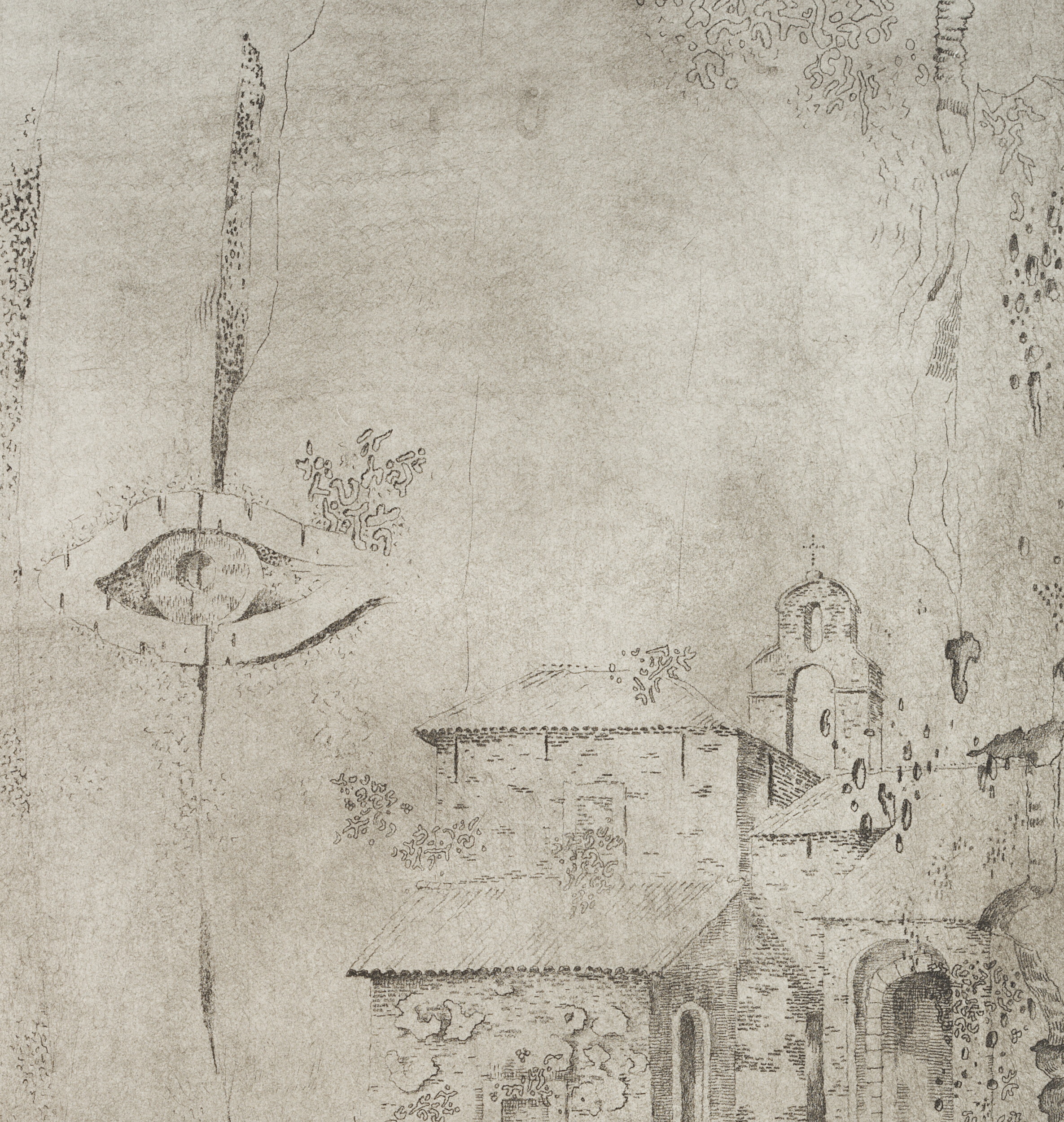 - Description: Collage of landscape and architectural fragments. Put together in such a way that faces, eyes, masks or side profiles can be discovered.