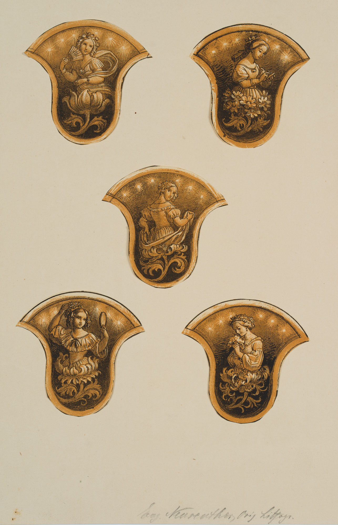 Eugen Napoleon Neureuther (1806 München – 1882 ebd.), Ausgeschnittene Lithographien mit weiblichen Figuren & Arabesken, 19. Jahrhundert, Lithographie
