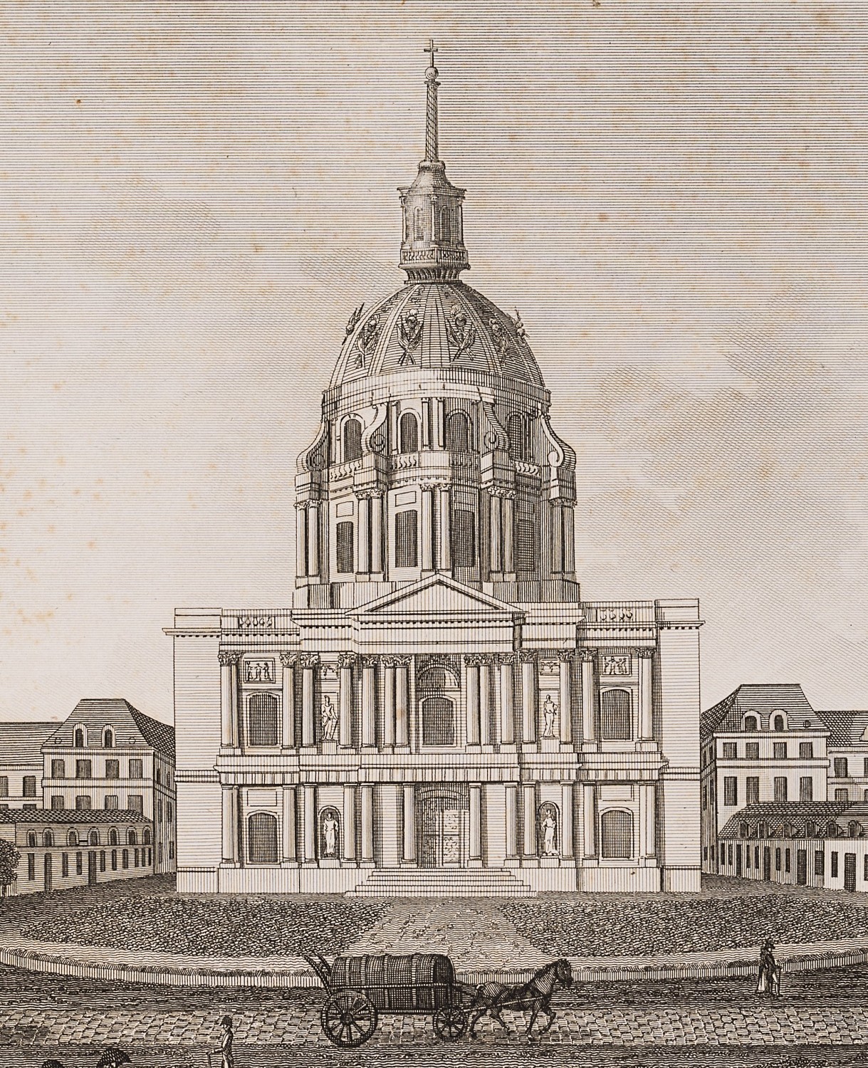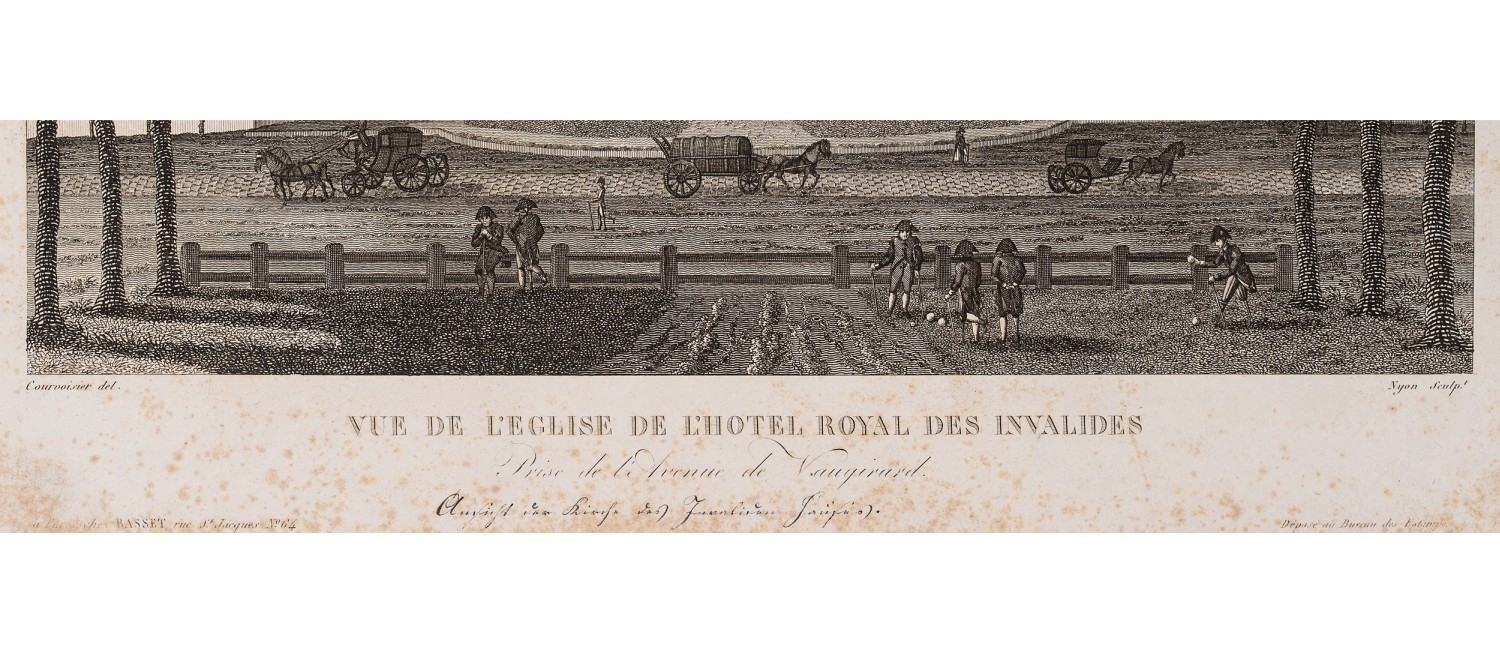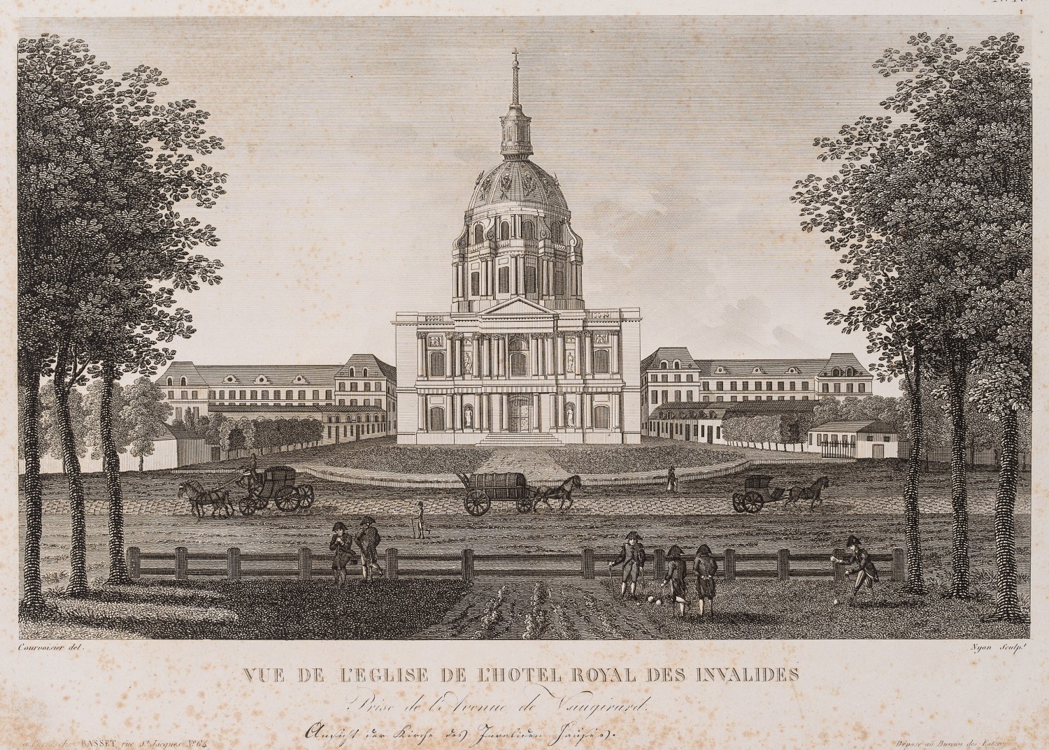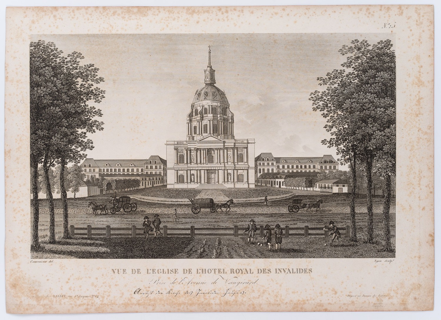 - Inscription: Signed and titled below the image in the printing plate: “Vue de l’Eglise de l’Hôtel Royal des Invalides”. Below titled in ink in German by another hand