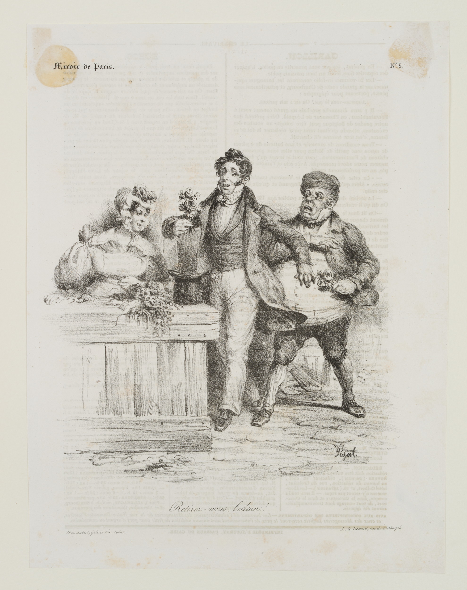 Caption. Translated from the French: “Pull – back, paunch!”. - Verso: Typographic printing, advertisements