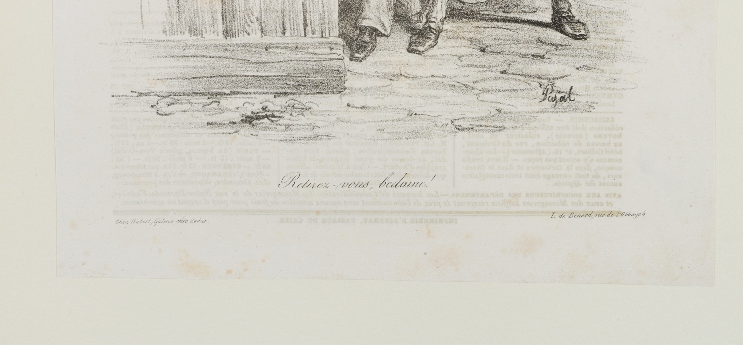 Bildunterschrift. Aus dem Französischen übersetzt: “Zieht – euch zurück, Wanst!” - Verso: Typographischer Druck, Werbeanzeigen