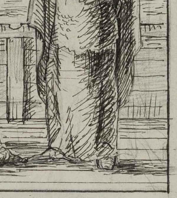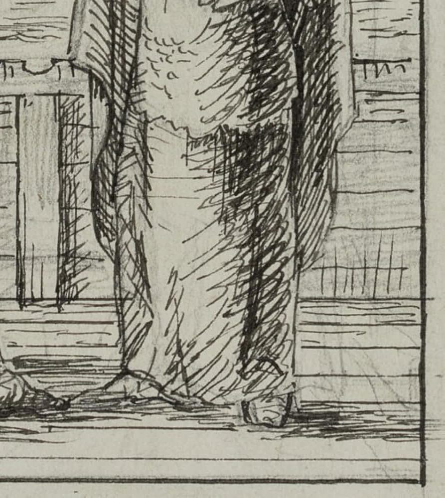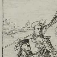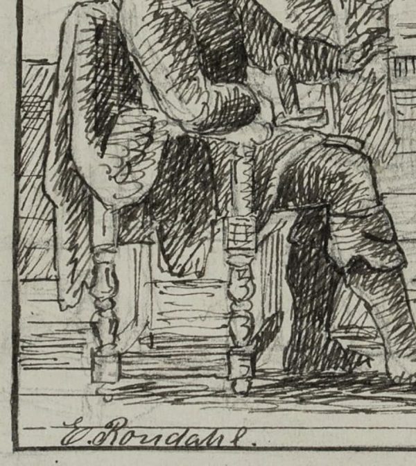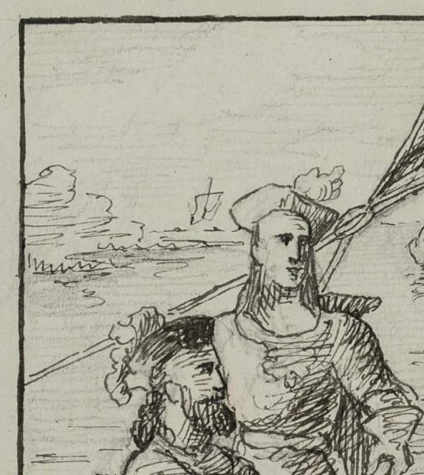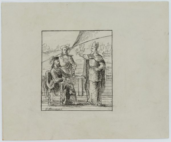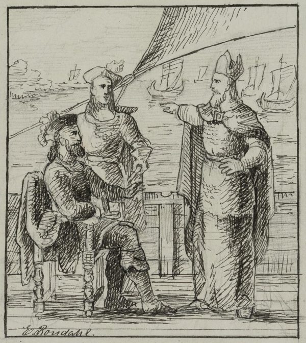 Emmery Rondahl (1858 Vordingborg – 1914 Kopenhagen), Bischof und König an Deck eines Schiffes, 1875, Federzeichnung