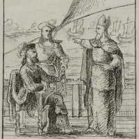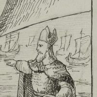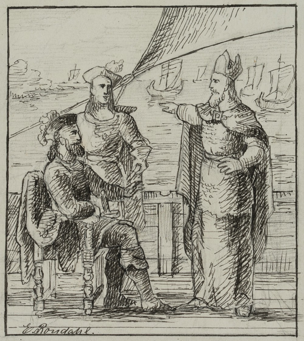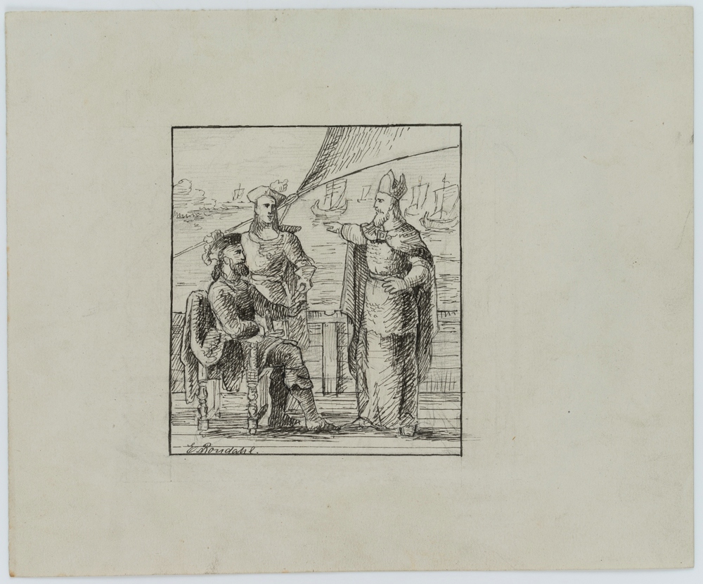 - Beschreibung: Historienszene an Deck eines Schiffes. Im Hintergrund ist eine ganze Flotte auf dem Wasser zu sehen. Die Zeichnung stammt aus einer Sammlung von Historien- und Sagendarstellungen mit nordischen Szenen und Themen aus der Hand des dänischen Künstlers Rondahl, der sich besonders als Zeichner einen Namen gemacht hat. Er lieferte die Entwürfe für zahlreiche historische, archäologische und literarische Schriften.