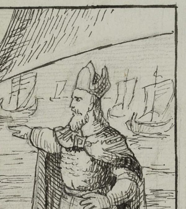 - Description: Historical scene on the deck of a ship. In the background a whole fleet can be seen on the water. The drawing comes from a collection of history and saga depictions with Nordic scenes and themes from the hand of the Danish artist Rondahl, who made a name for himself especially as a draughtsman. He provided the designs for numerous historical, archaeological and literary writings.