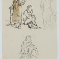 - Description: Full-length figure studies with standing old women and crouching warriors in medieval Nordic costume. The drawing is from a collection of history and saga depictions with Nordic scenes and themes from the hand of the Danish artist Rondahl, who made a name for himself especially as a draughtsman. He provided the designs for numerous historical, archaeological and literary writings.