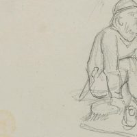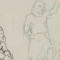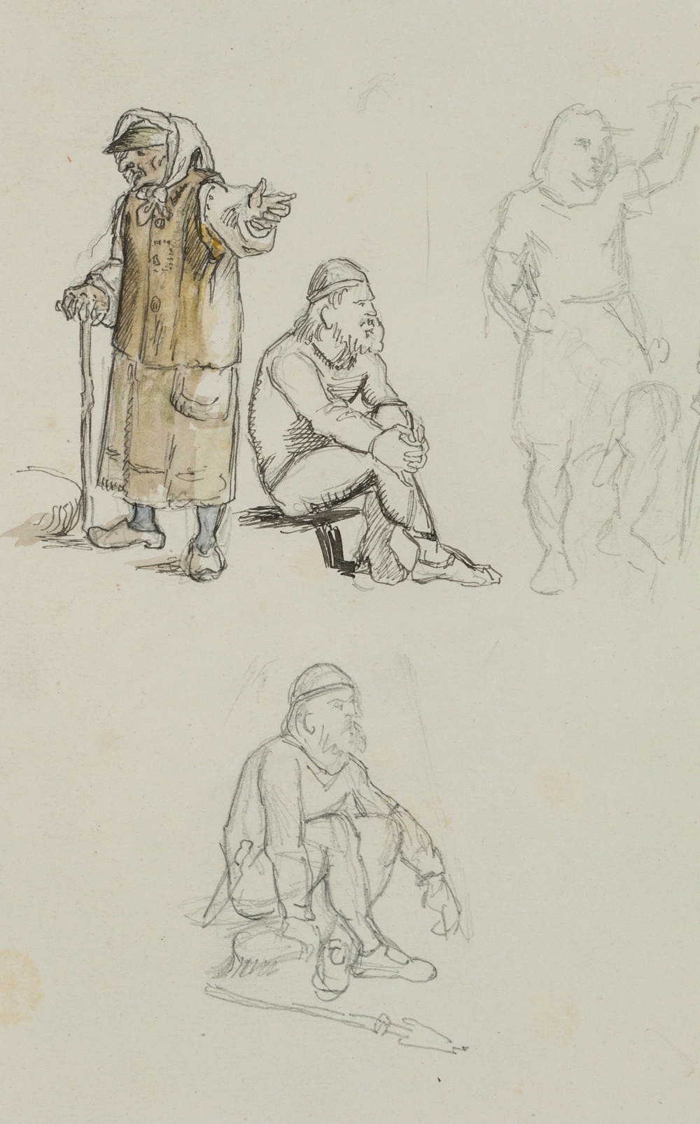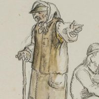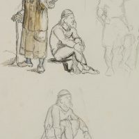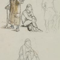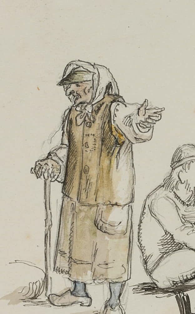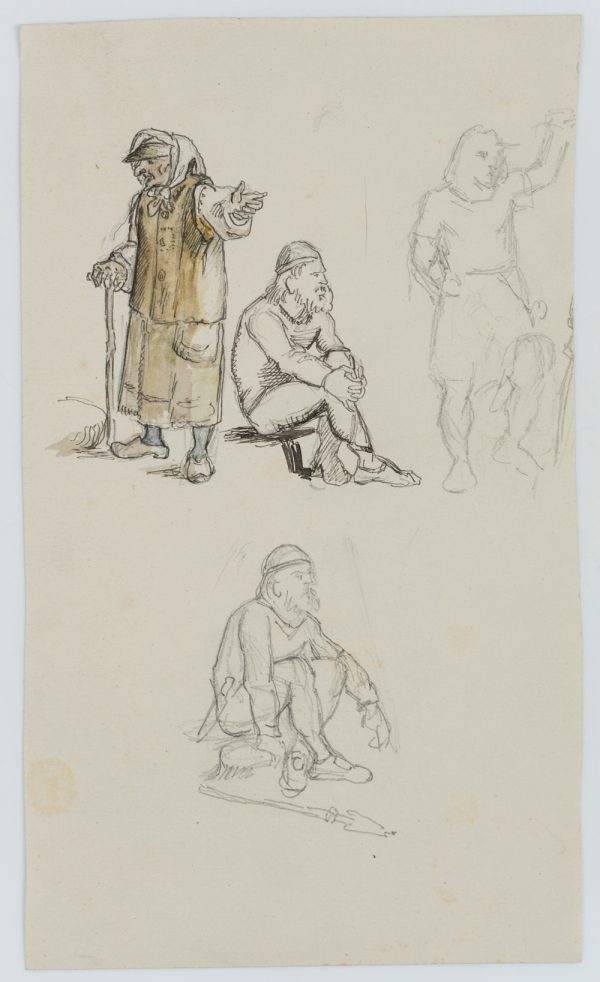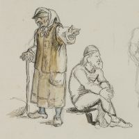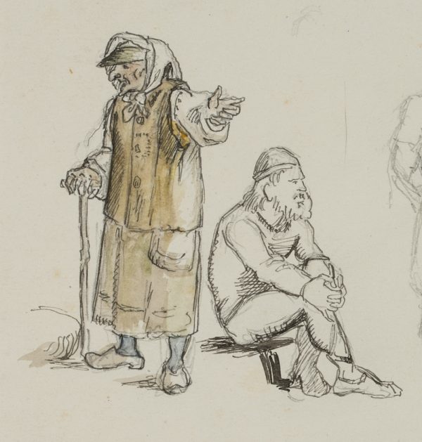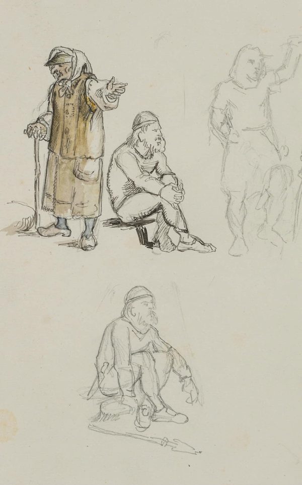 - Beschreibung: Ganzfigurige Figurenstudien mit stehender Alten und hockenden Kriegern in mittelalterlicher nordischer Tracht. Die Zeichnung stammt aus einer Sammlung von Historien- und Sagendarstellungen mit nordischen Szenen und Themen aus der Hand des dänischen Künstlers Rondahl, der sich besonders als Zeichner einen Namen gemacht hat. Er lieferte die Entwürfe für zahlreiche historische, archäologische und literarische Schriften.