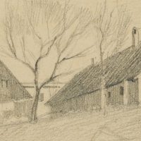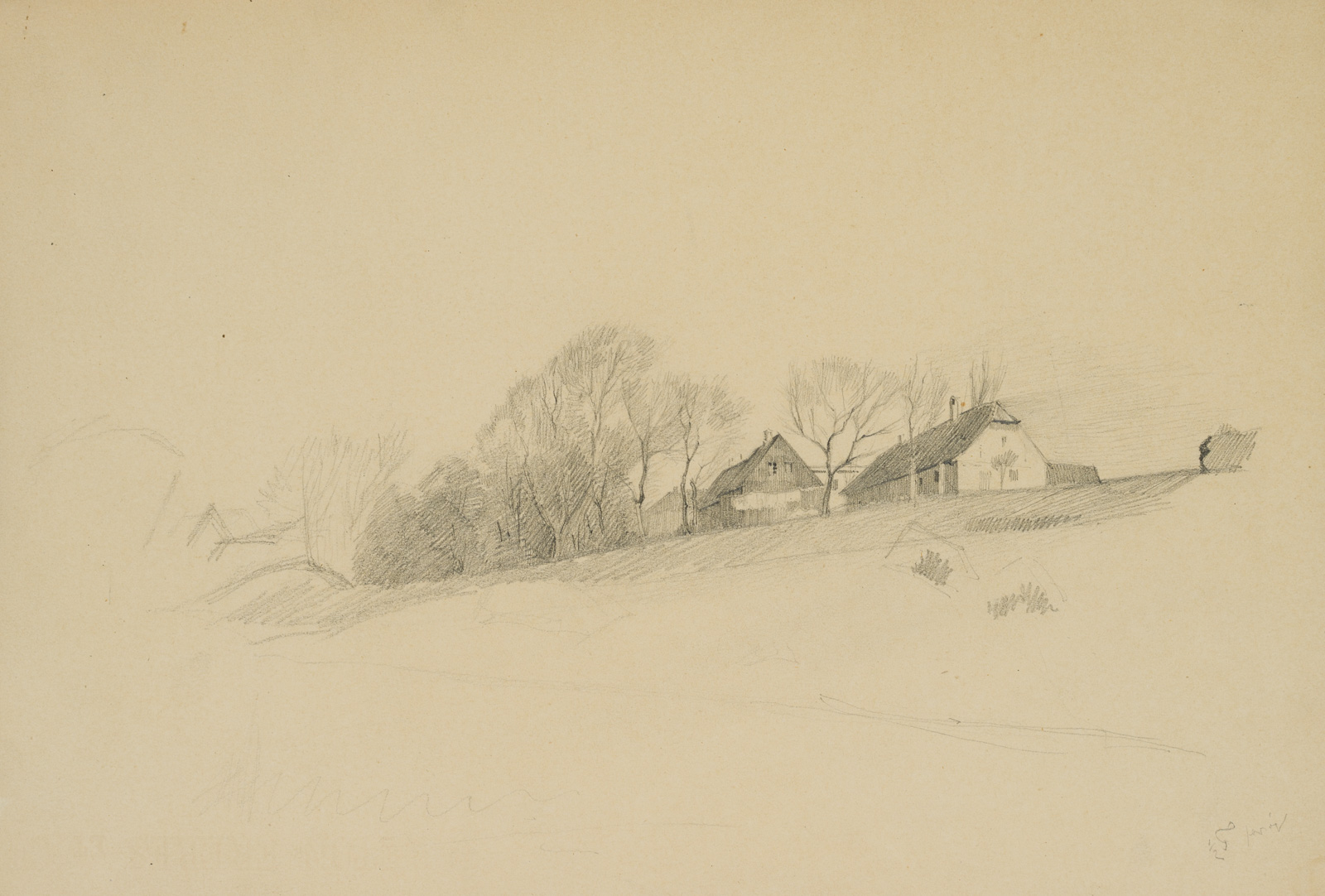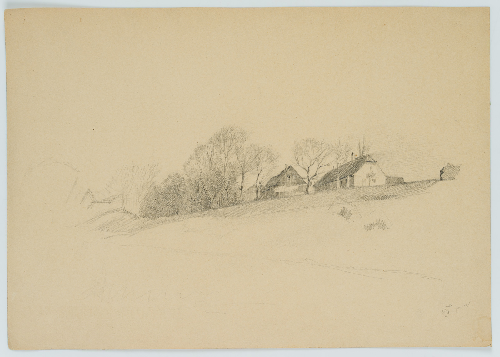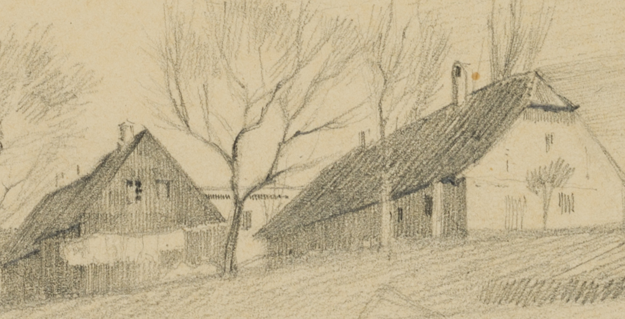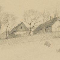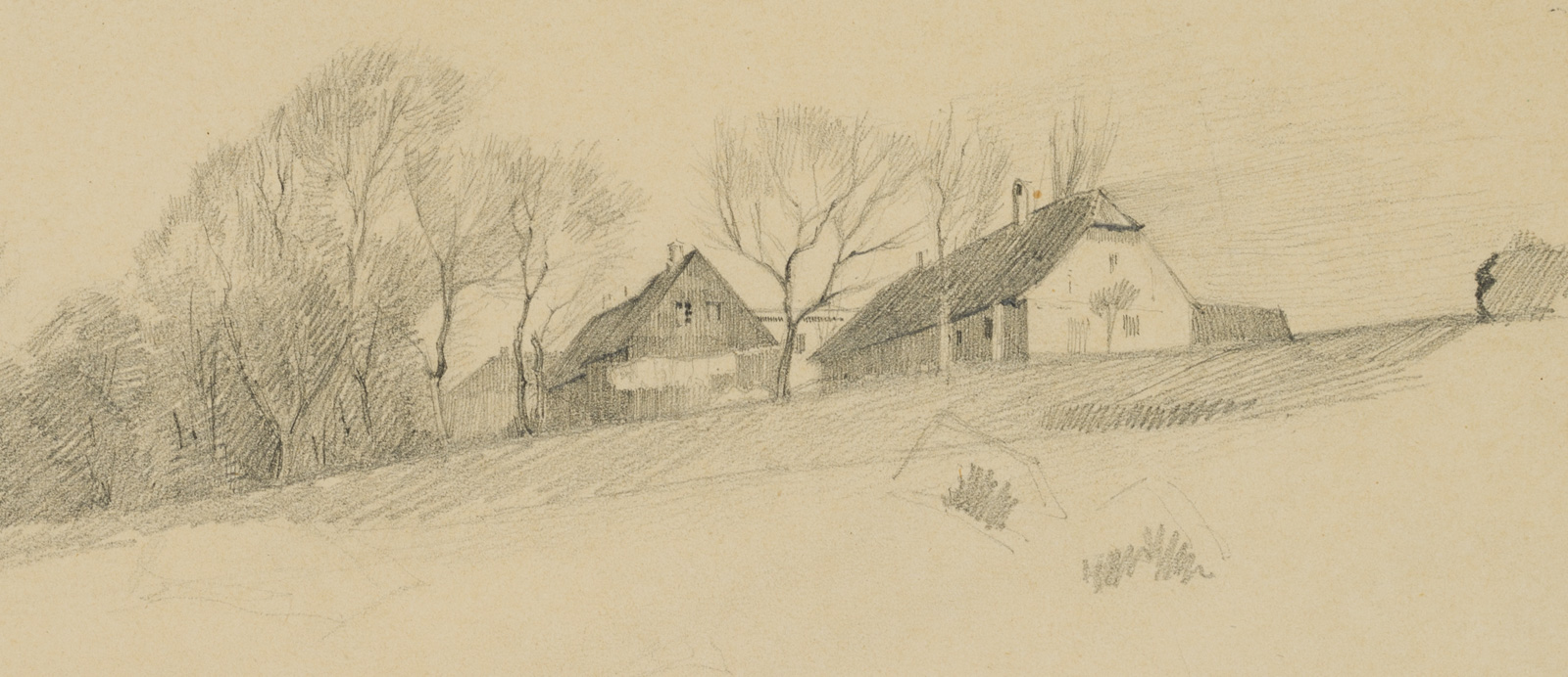 Emmery Rondahl (1858 Vordingborg – 1914 Kopenhagen), Gehöft in pittoresker Landschaft, um 1880, Bleistift