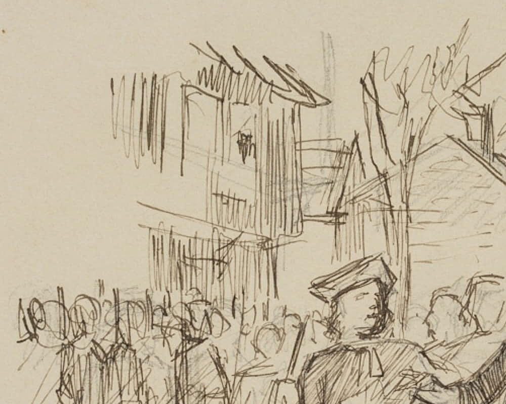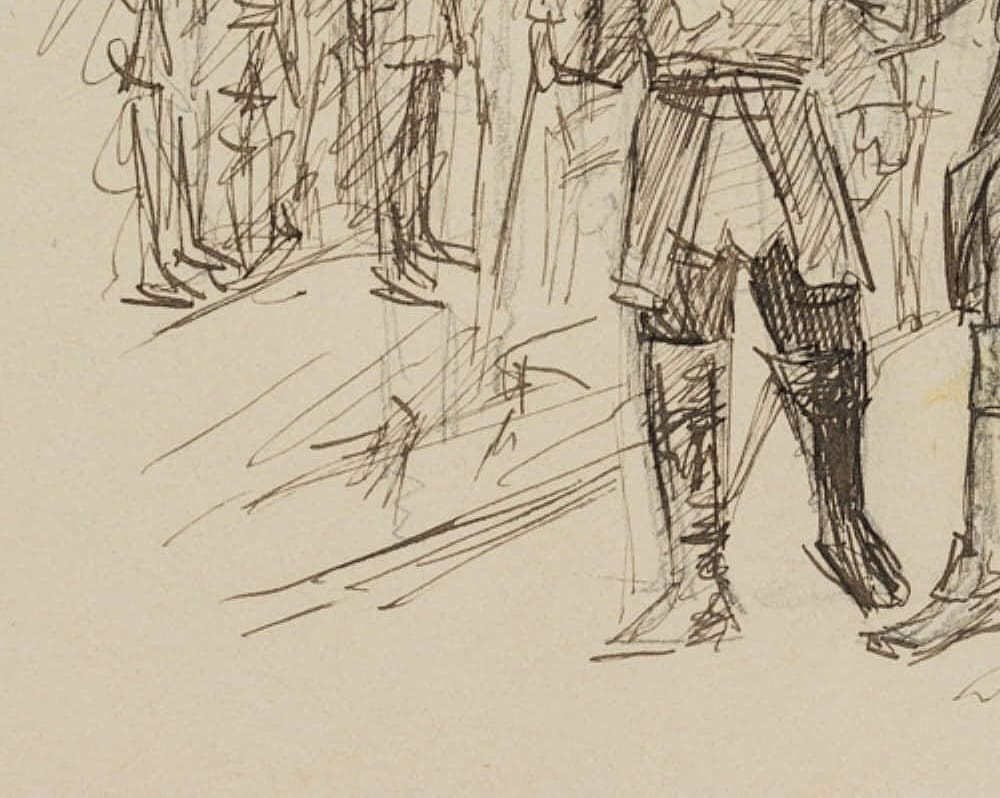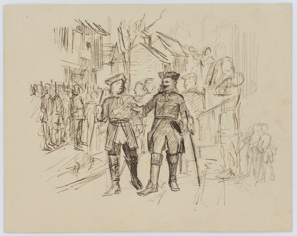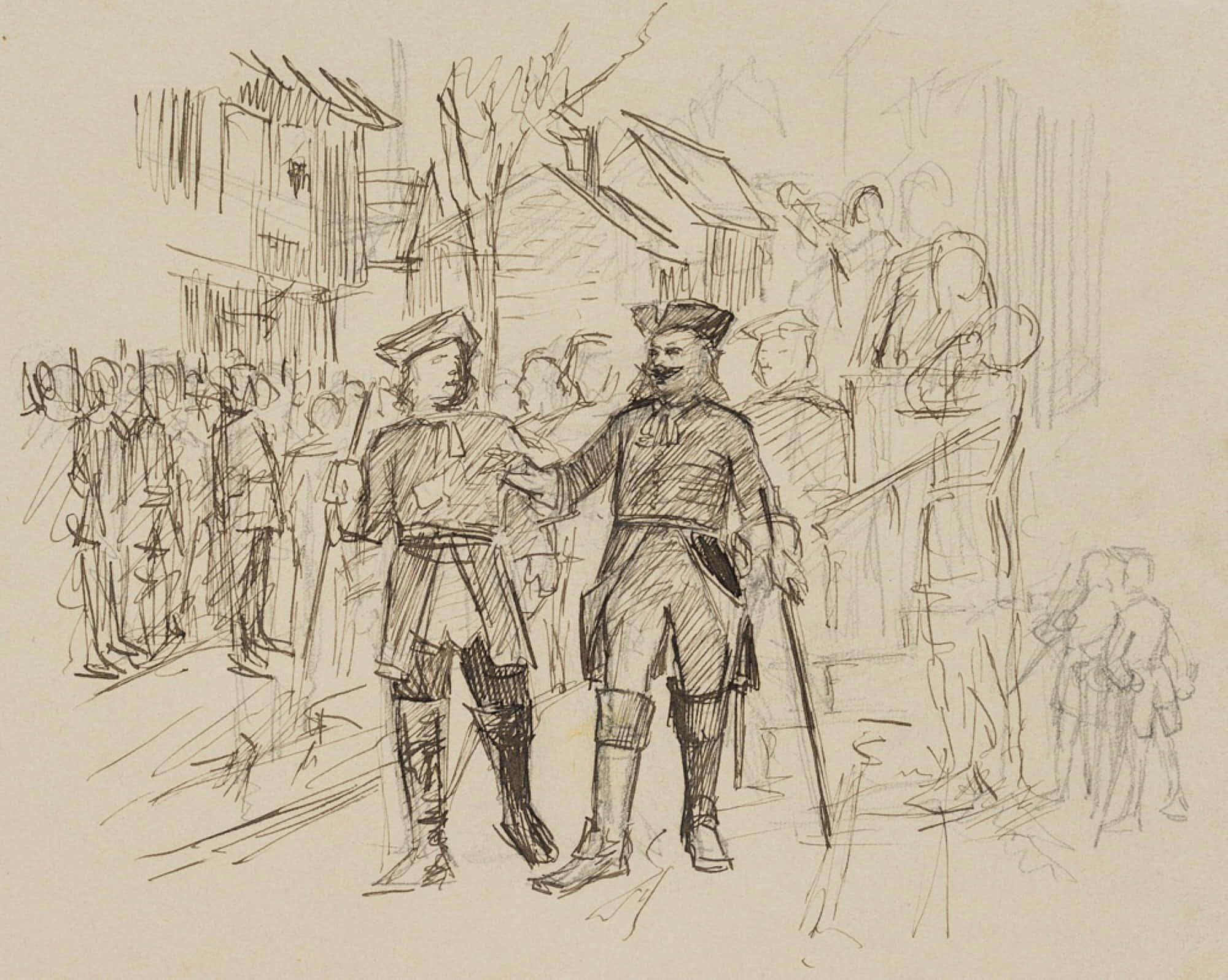 • Description: History scene in the streets of a village. While roughly sketched soldiers are depicted on the sides, the artist shows two officers in 17th century uniform striding in the foreground. Perhaps the bearded man is Christian IV of Denmark and Norway. The drawing comes from a collection of history and saga depictions with Nordic scenes and themes from the hand of the Danish artist Rondahl, who made a name for himself especially as a draughtsman. He provided the designs for numerous historical, archaeological and literary writings.