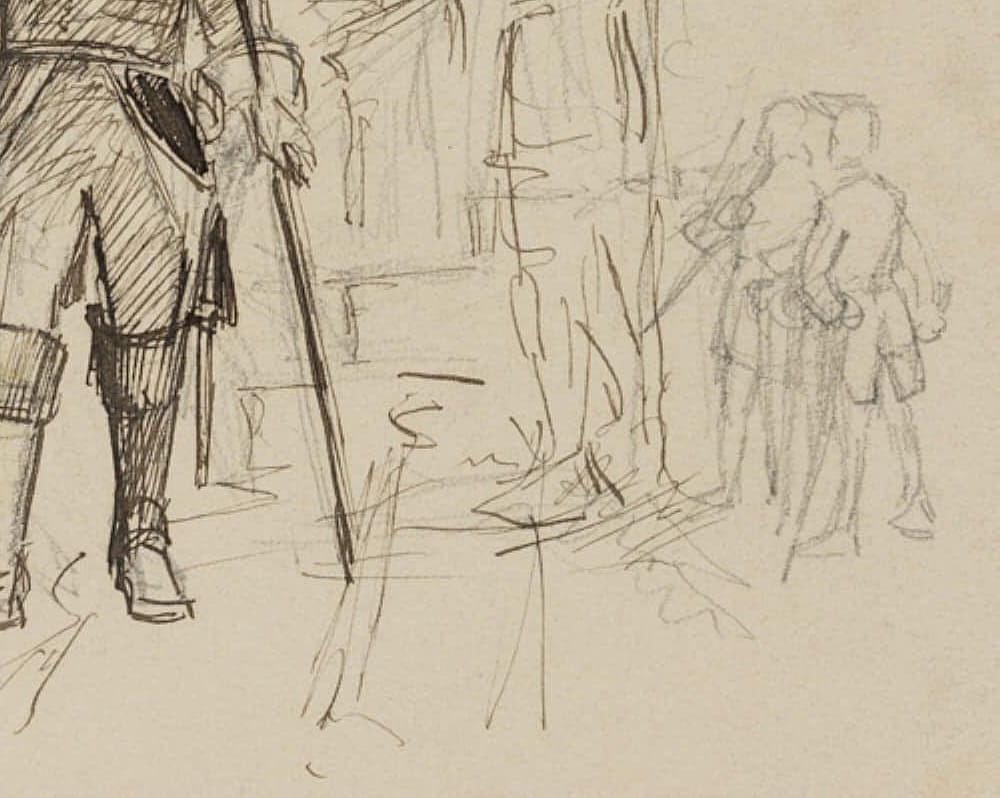 • Beschreibung: Historienszene in den Straßen einer Ortschaft. Während an den Seiten grob skizzierte Soldaten dargestellt sind, zeigt der Künstler im Vordergrund zwei einherschreitende Offiziere in Uniformtracht des 17. Jahrhunderts. Vielleicht handelt es sich bei dem bärtigen Mann um Christian IV. von Dänemark und Norwegen. Die Zeichnung stammt aus einer Sammlung von Historien- und Sagendarstellungen mit nordischen Szenen und Themen aus der Hand des dänischen Künstlers Rondahl, der sich besonders als Zeichner einen Namen gemacht hat. Er lieferte die Entwürfe für zahlreiche historische, archäologische und literarische Schriften.