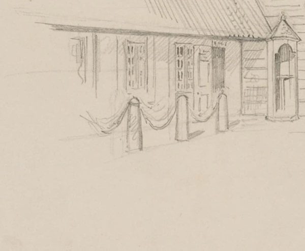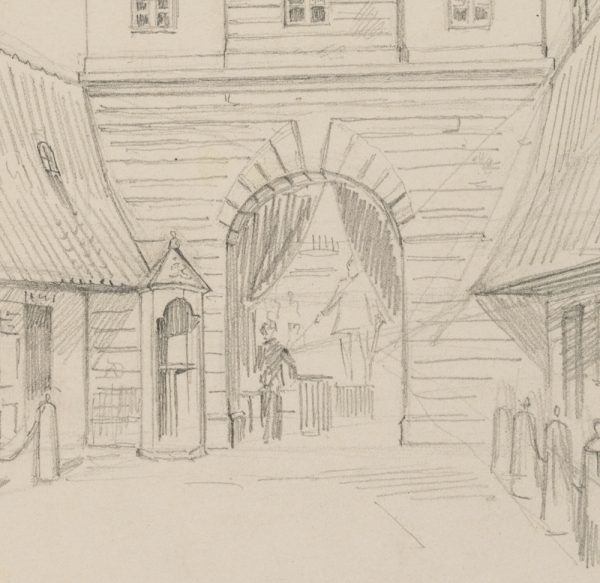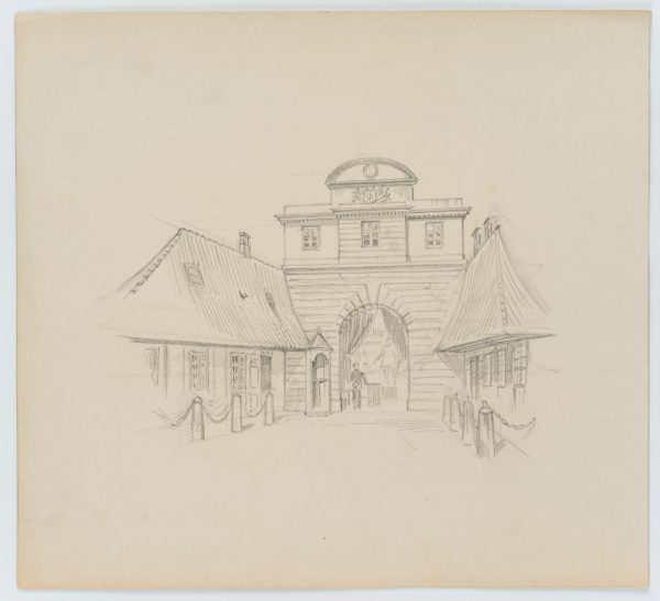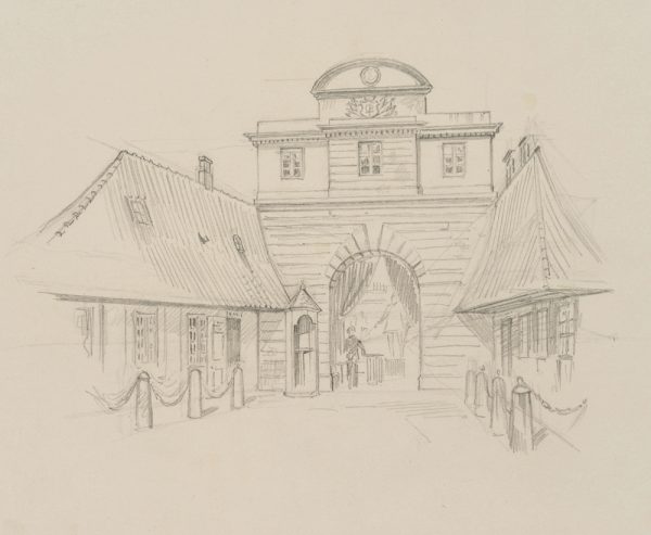 - Description: From the sketchbook of the Danish artist Rondahl, this sheet shows a magnificent classical archway, presumably leading to a castle or a residence in Denmark or Norway. In front of the gate is a guardhouse and a sentry post. A large statue can be seen in the courtyard.