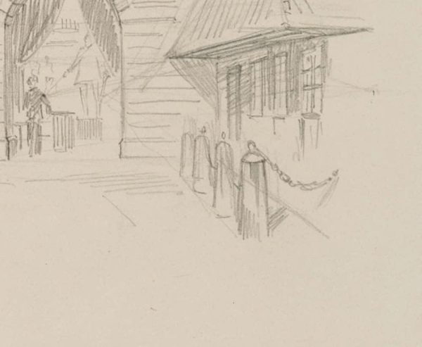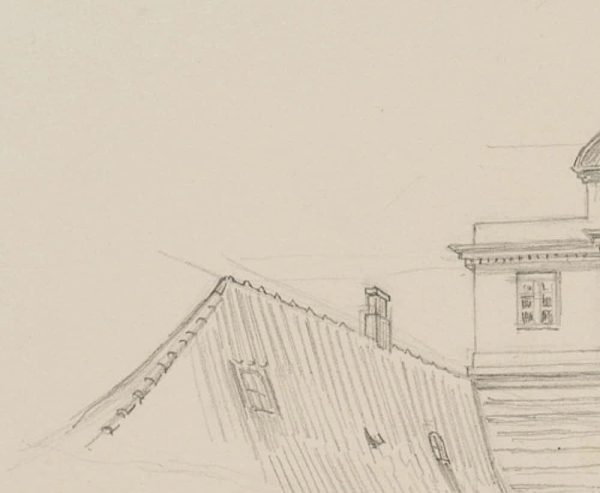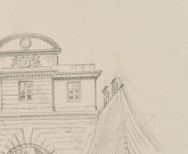 - Beschreibung: Aus dem Skizzenbuch des dänischen Künstlers Rondahl stammend, zeigt dieses Blatt einen prunkvollen klassizistischen Torbogen, der vermutlich zu einem Schloss oder einem Residenzsitz in Dänemark oder Norwegen führt. Vor dem Tor ist ein Wachhäusschen zu sehen sowie ein Wachtposten. Im Hof ist ein großes Standbild auszumachen.