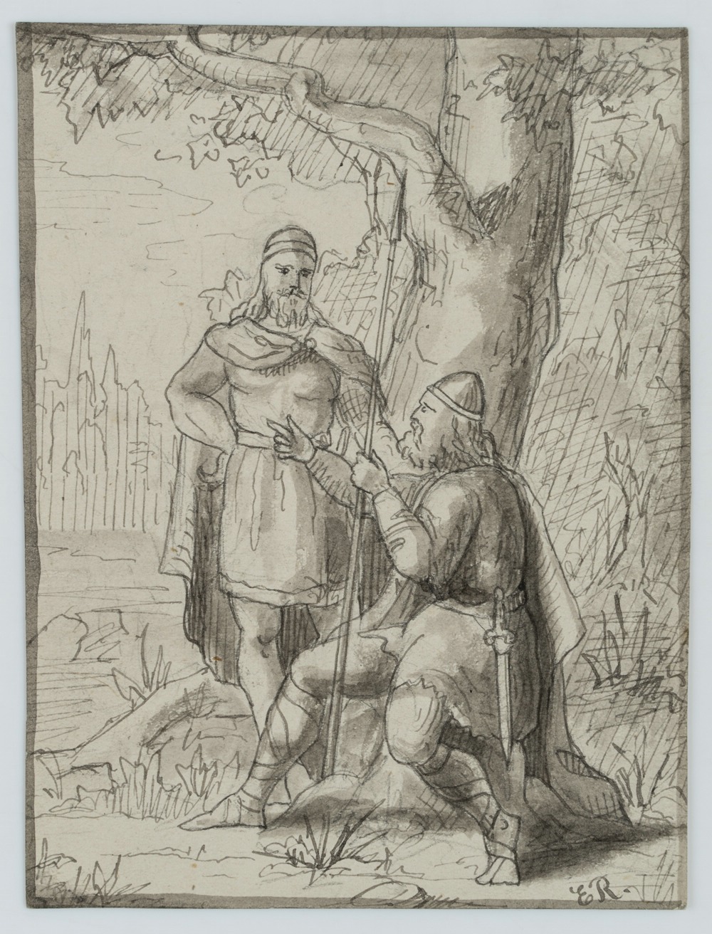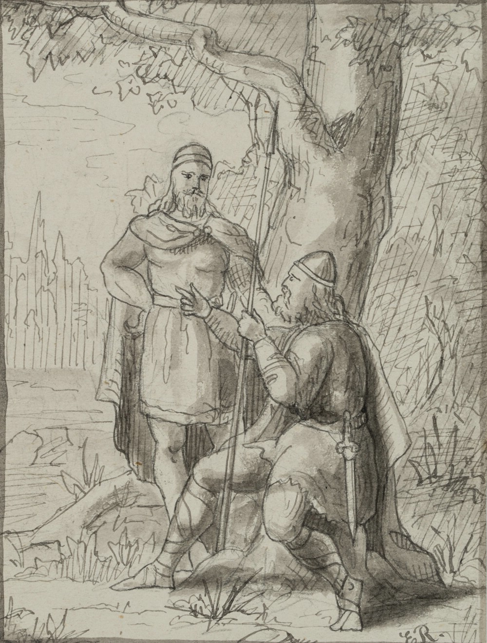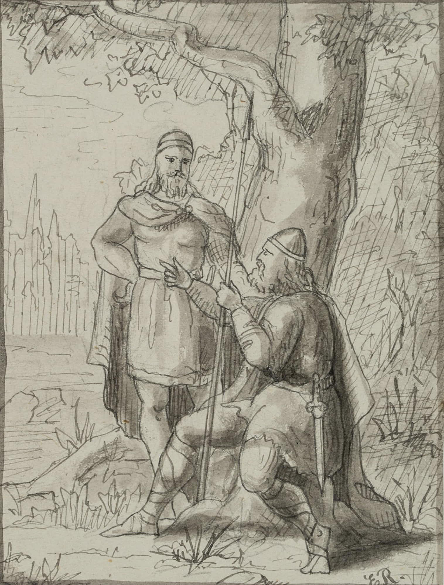 - Description: Quiet scene with the cousins Knud Lavard and Magnus den Stærke in Viking costume. In 1131, the infamous murder of Knud lavard took place near Haraldsted in Denmark, which was to trigger a civil war. The drawing is from a collection of history and saga depictions with Nordic scenes and themes from the hand of the Danish artist Rondahl, who made a name for himself particularly as a draughtsman. He provided the designs for numerous historical, archaeological and literary writings.