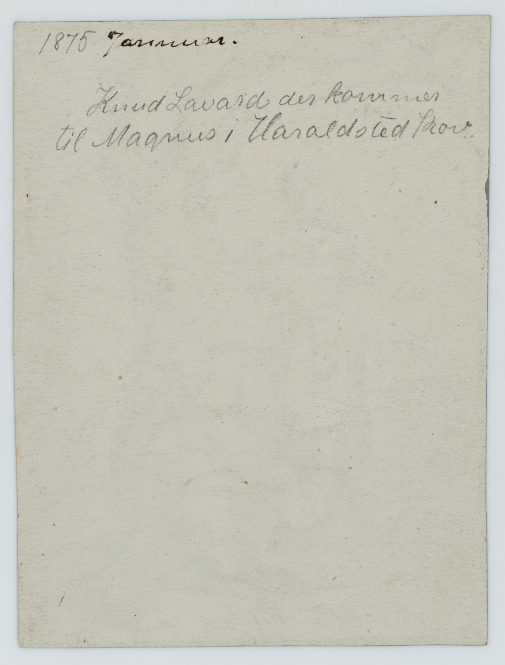 - Bezeichnung: Unten rechts mit dem Monogramm des Künstlers signiert. Rückseitig in Bleistift datiert und bezeichnet: “1875 Januar. | Knud Lavard der kommes til Magnus i Haraldsted Skov”